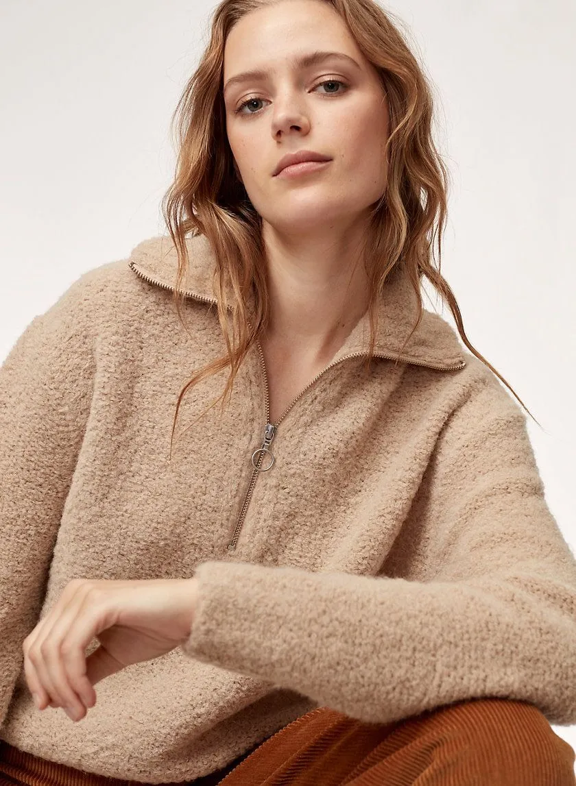 An Aritzia classic. Warm and fuzzy quarter-zip sweater. Made with an alpaca wool blend. Slightly cropped with a relaxed fit. Colour is Lt Honey Beige (currently sold out). Retails for $138. Almost brand new; literally worn 2-3 times max.