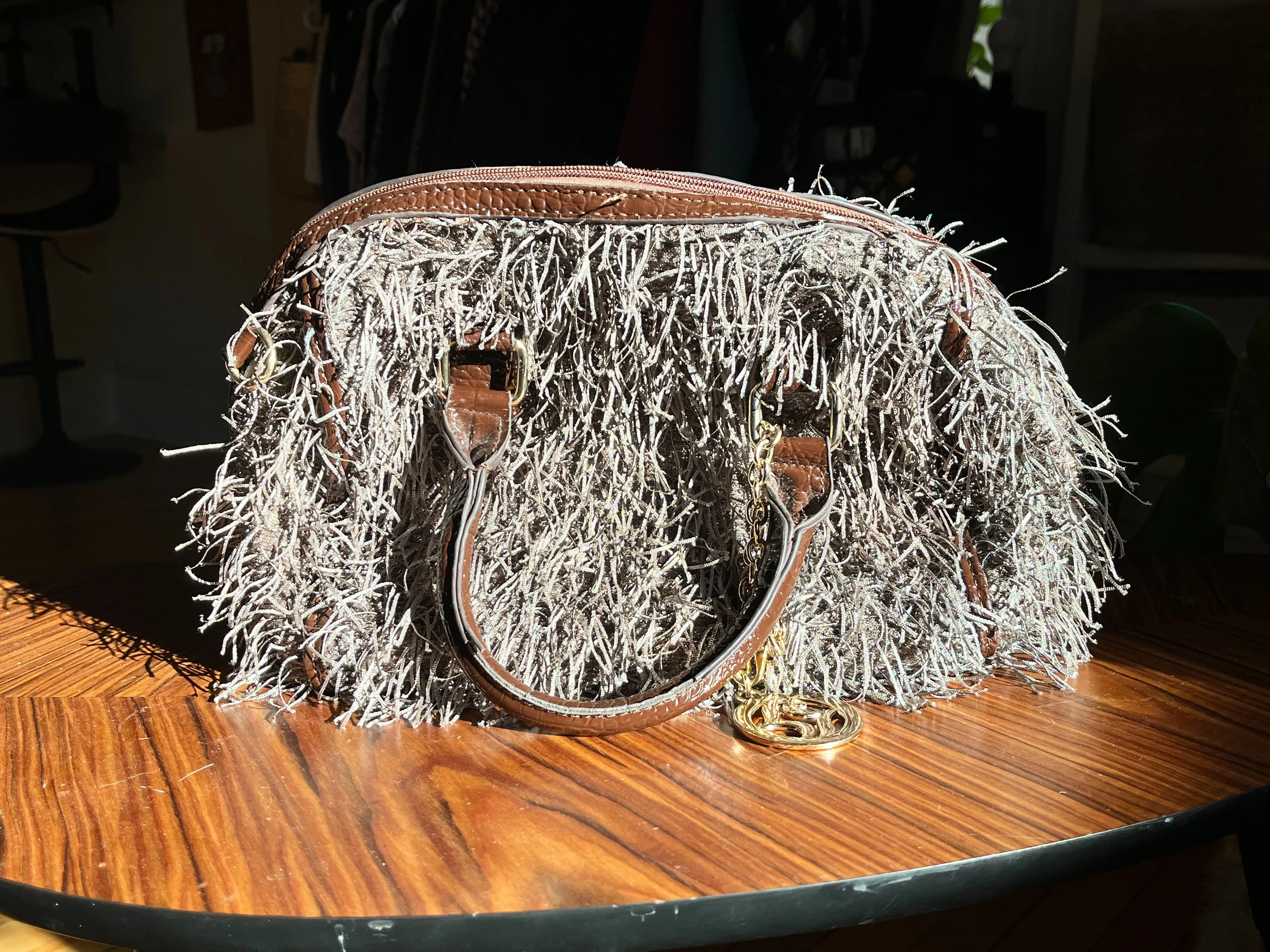Purse is a medium sized bag! Leather handles. Gold earlier zippering and heads.