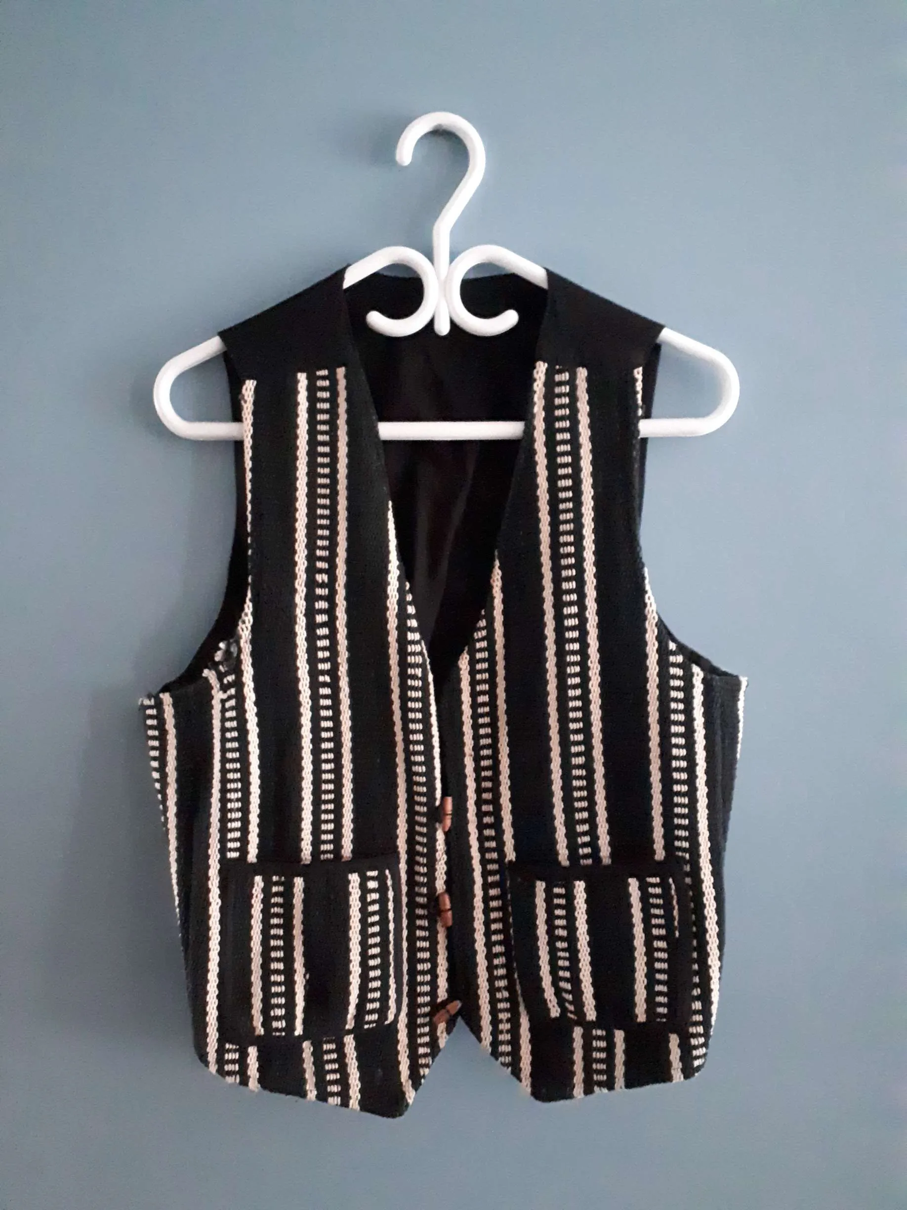 Made in Nepal. 100% cotton. Size medium. Wooden buttons. Top one needs to be sewn back in.