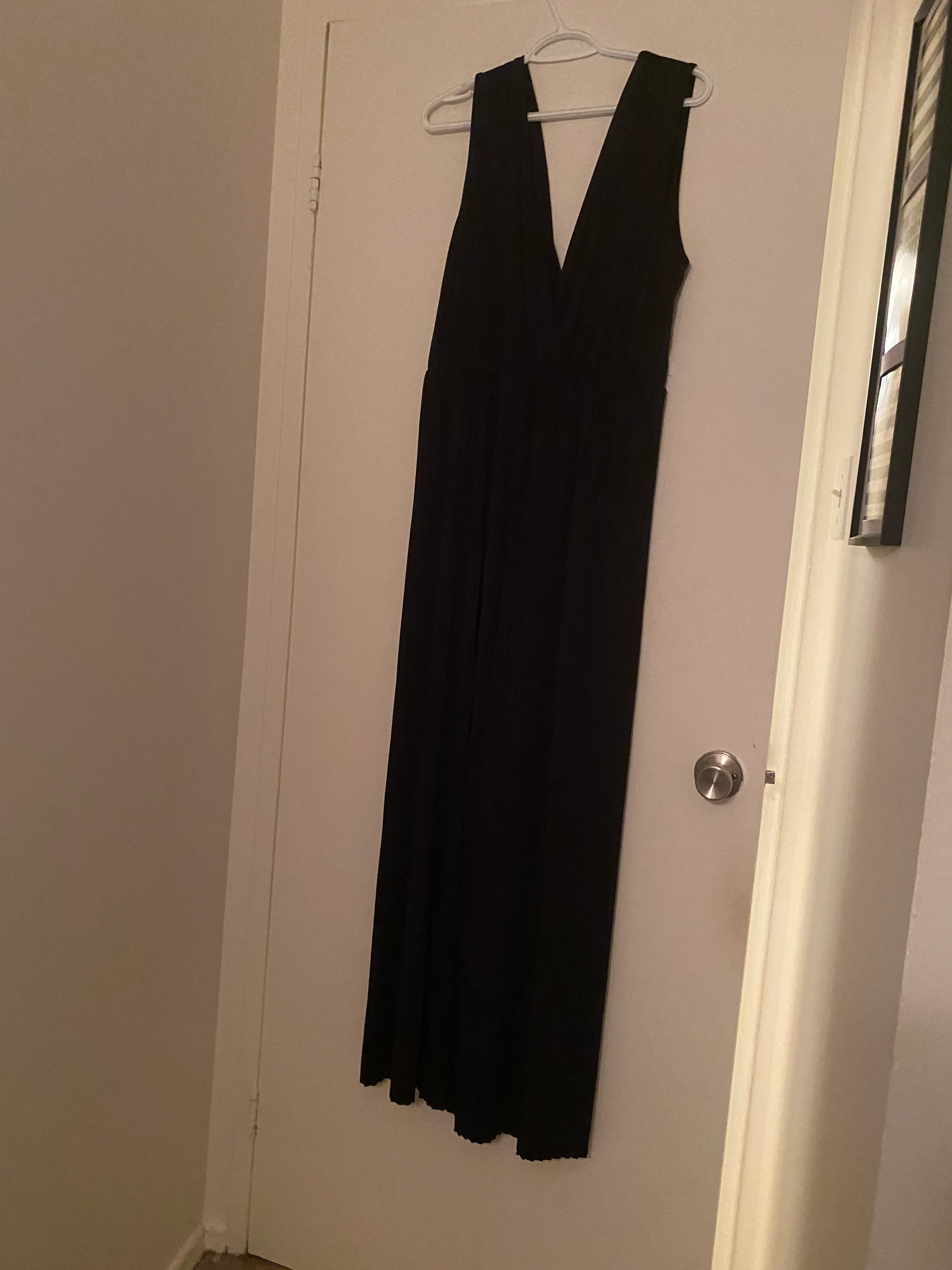 Very cute jumpsuit with elastic waist. I am 5’5 and it was sadly too long on me. It has hoops for a belt but I don’t have one for it.