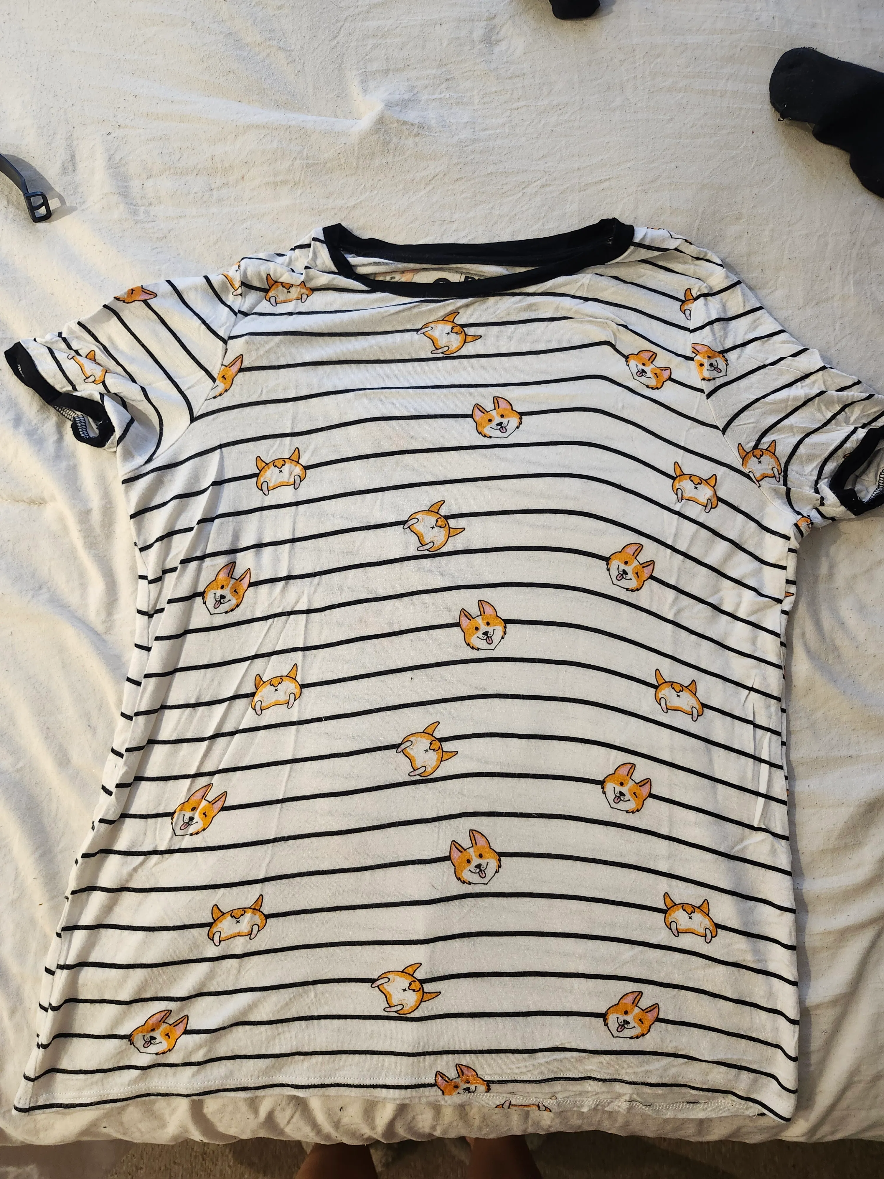 A soft, short-sleeved shirt. Features a print of corgis and striped detailing. You can wear this tee while relaxing at home.