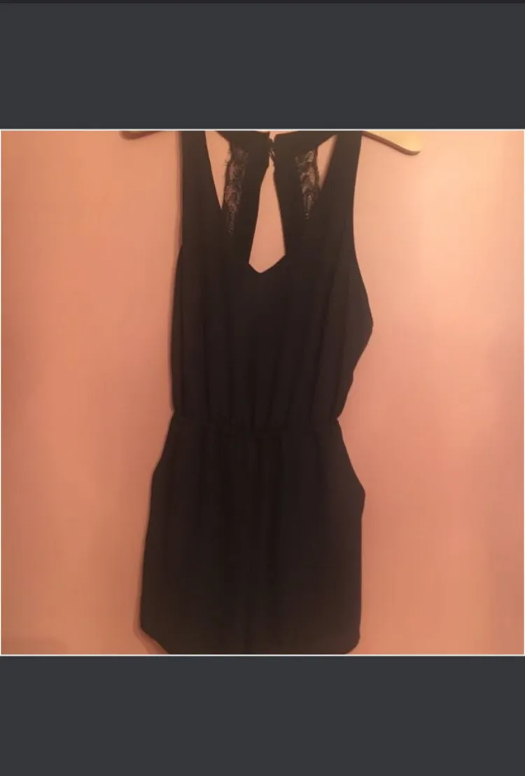 So so comfy, V neck style, this buttons at the back of ur neck with a nice open lace pattern on ur back. POCKETS!!!!! Originally from Forever 21, the only flaw is that one of the two buttons that fasten at the back is broken but I’ve worn this broken so many times and it looks exactly the same and doesn’t feel any different. Says size small but the waistband is super stretchy and could fit size medium too.