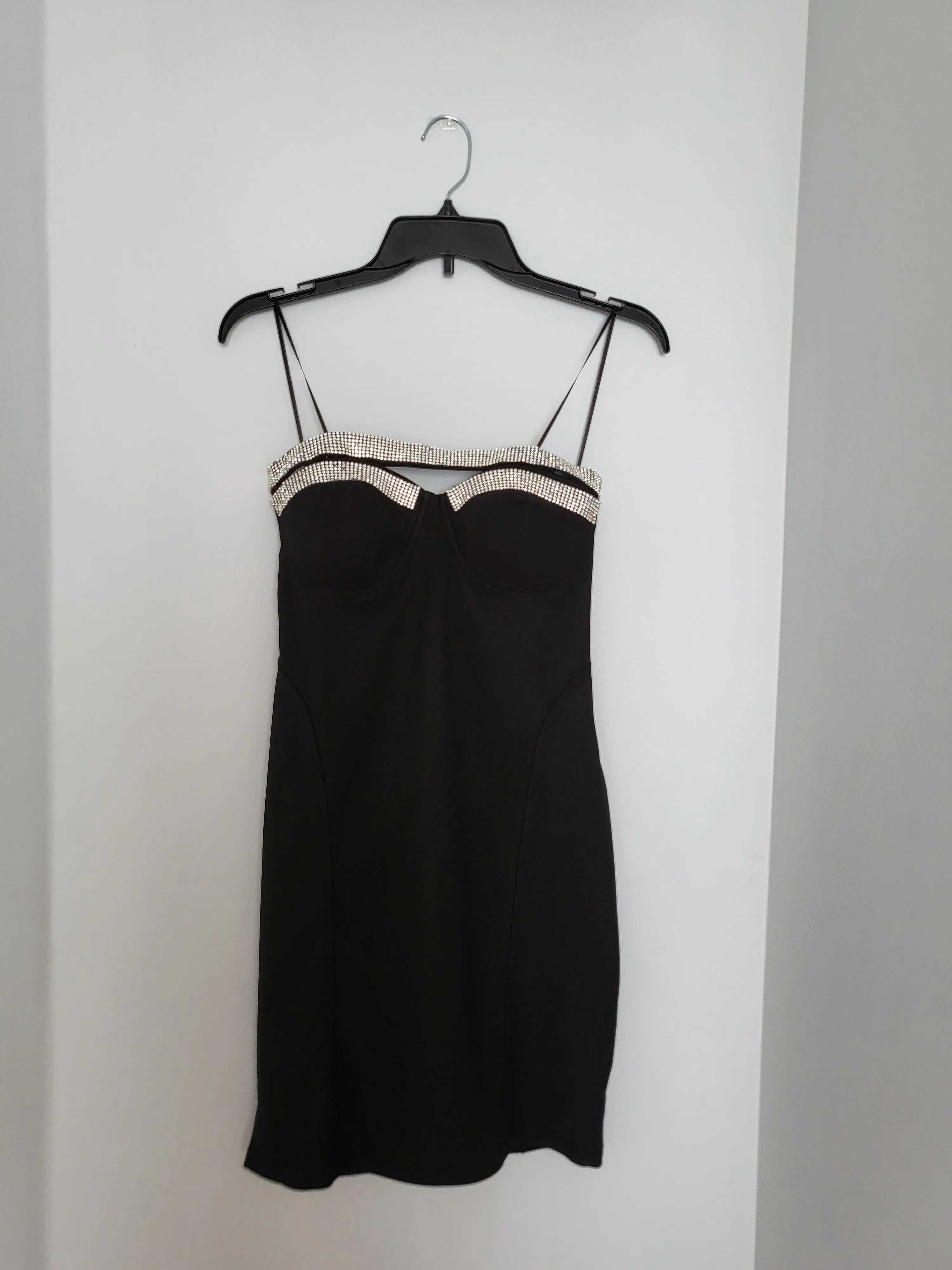 Has a jeweled/rhinestone trim neckline Doesn't have tags anymore but this one is a size 04-06 (small - medium) Very lightly worn