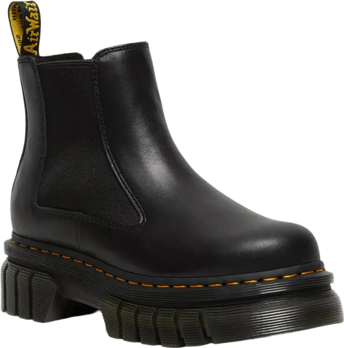 Full description from web site: A towering platform. With everyday wearability. These newly-evolved Chelsea boots pack all the height of our renowned Quad platform into a cutting-edge lightweight construction. Set on an innovative two-part sole — a lightweight EVA midsole and PVC outsole with rugged deep cleats — they bring less weight and more attitude. DM's at full volume. The boots are marked with all our signature DNA, including an amped-up edition of our unmistakable DMS tread pattern, as well as yellow welt stitching and a scripted AirWair heel loop.