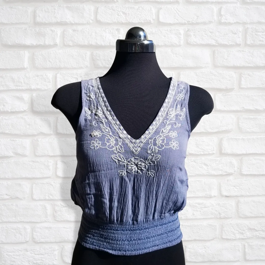 Brand new light blue with white embroidery sleeveless shirt by Others Follow. Size small.