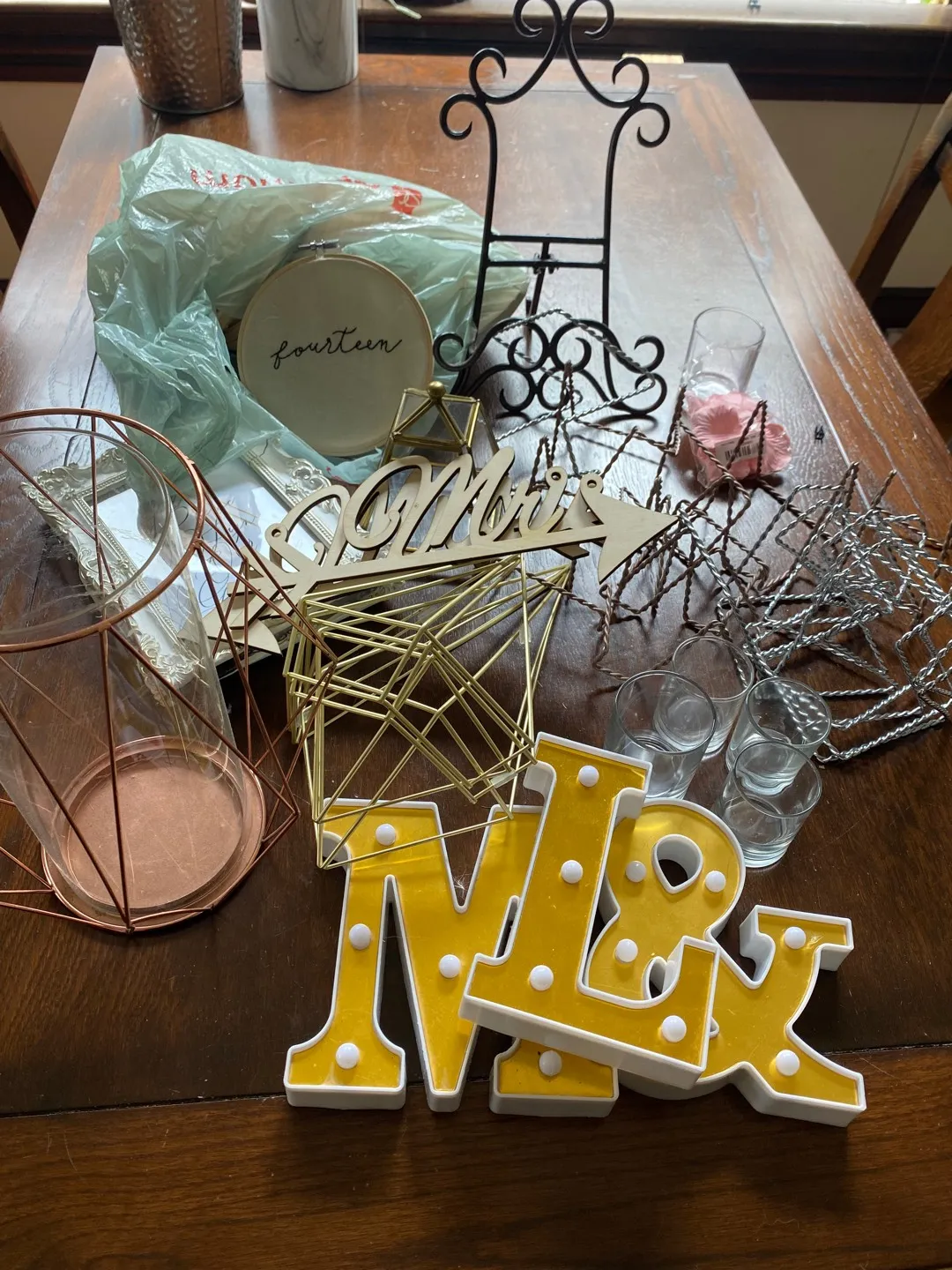 Frames, light letters, votives, flower petals, table numbers, rose gold hurricane lamp…