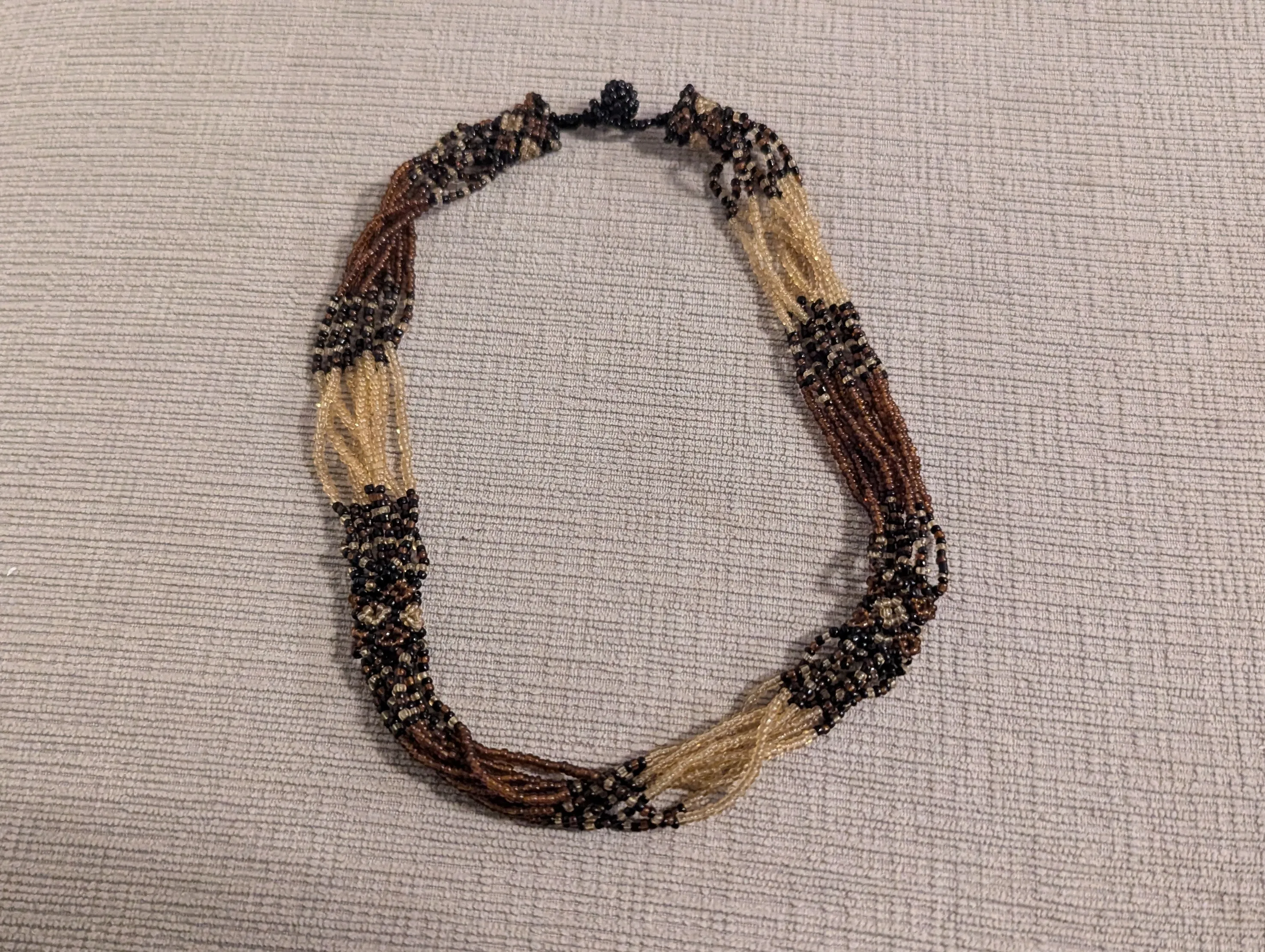 Brown and beige beaded necklace. Adjustable length with a knotted closure.