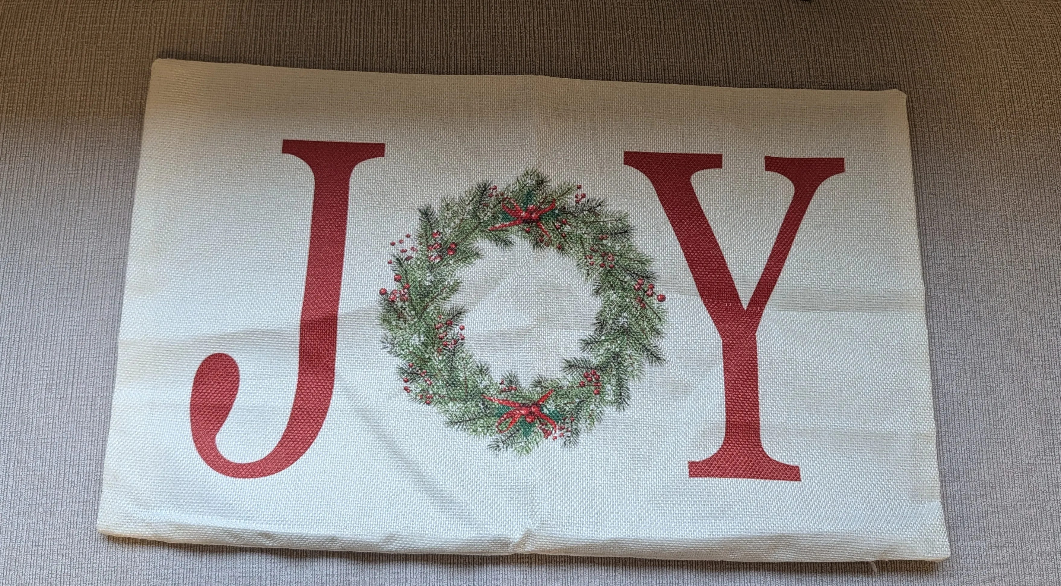 Add a touch of holiday cheer to your home with this lovely throw pillow cover! The cover features the word "JOY" with a festive wreath design. It's in new condition and ready to brighten up your living space.
