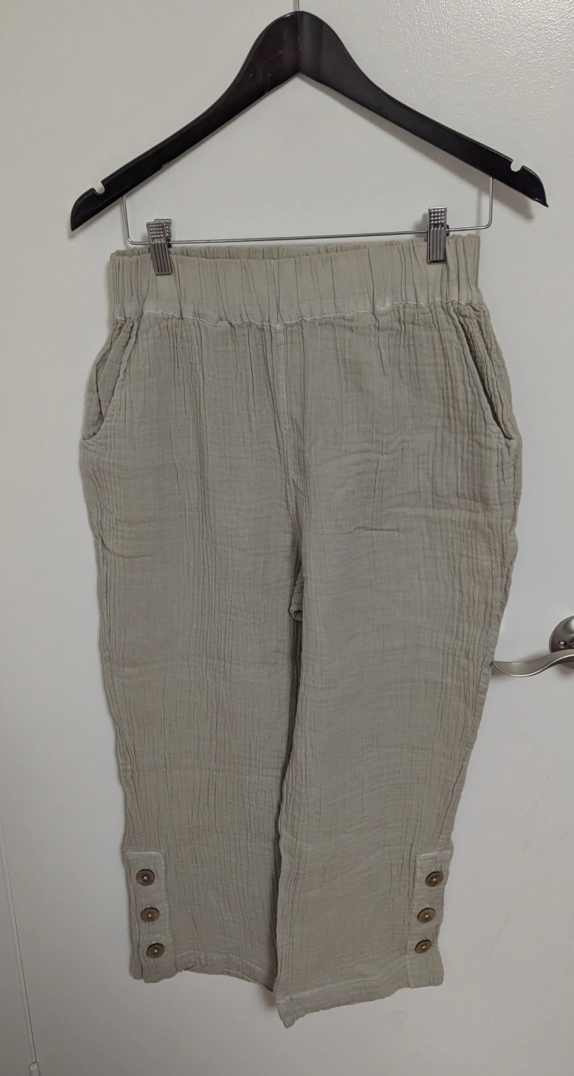 These are The Post Office Sandy Crop Pants in Chalk, size small. They feature a comfortable elastic waistband and button details at the hem.