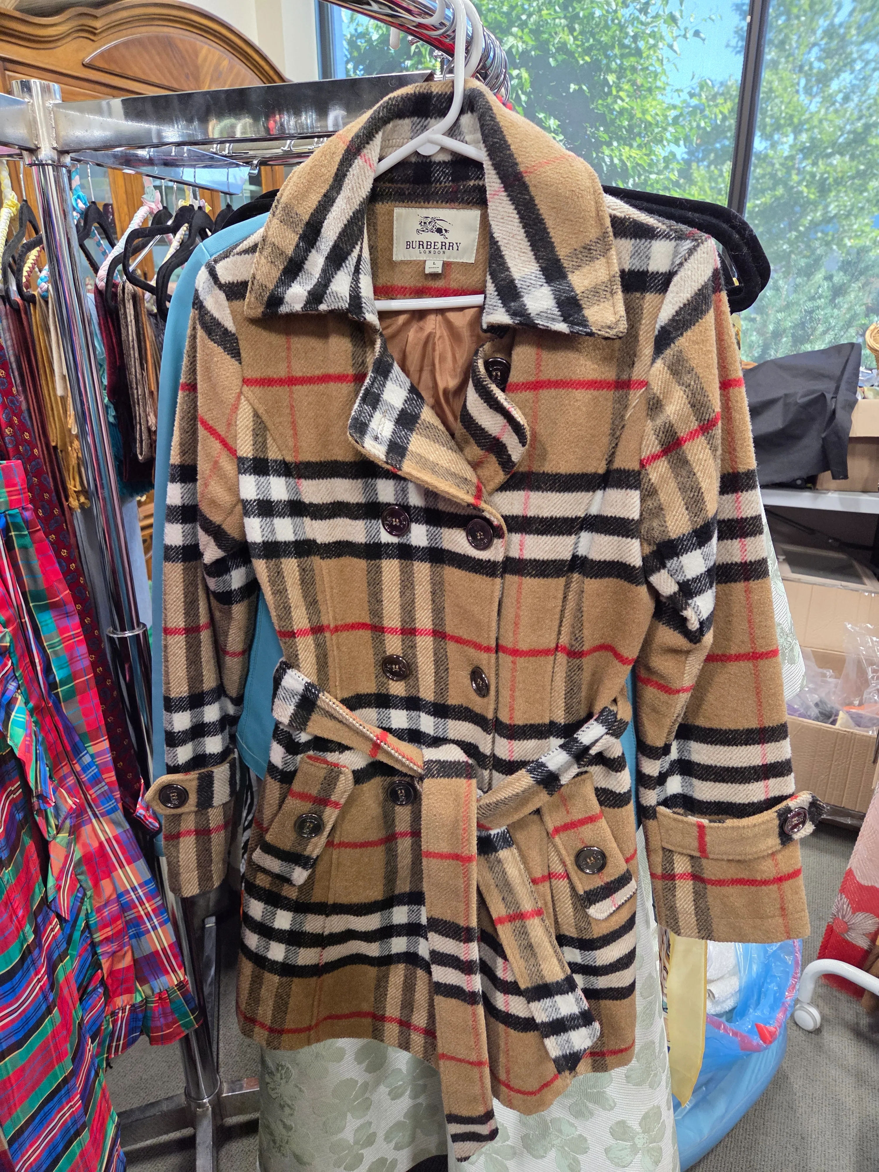 Size Large. Belted style button up jacket. Gently worn pre loved by my sister! Pet snd smoke free home. Come try it on at my storage spot during monday to friday 830am to 430pm by appointment.