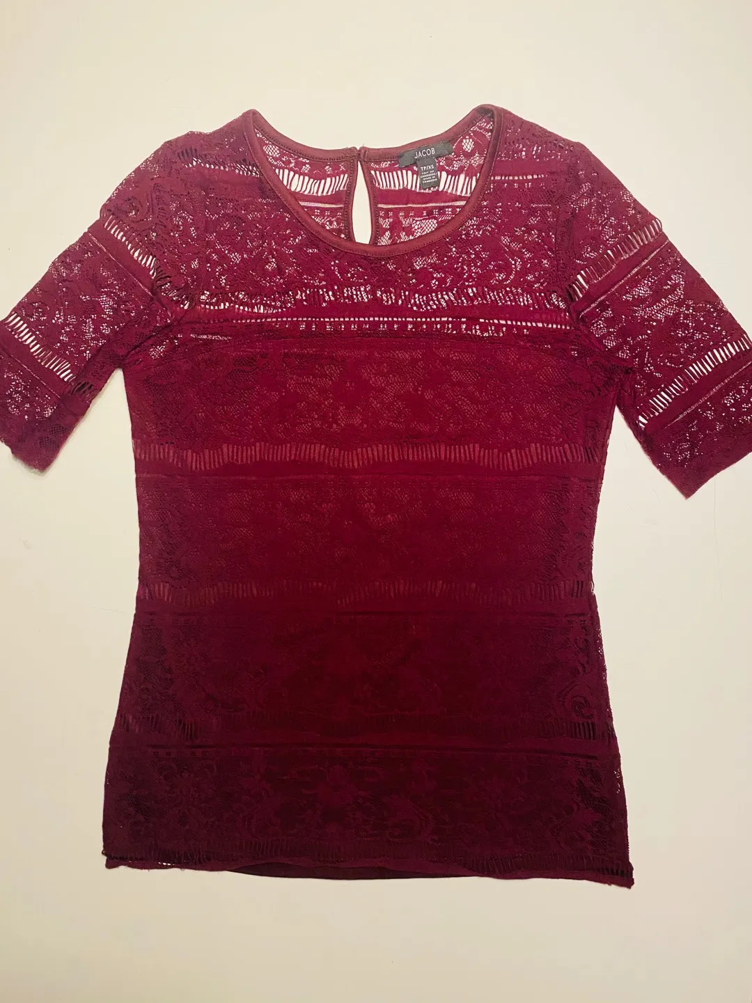 Size XS. Such a pretty and flattering style and colour (see through lace above the bust, lined underneath). Looks great tucked in to high-waisted pants and skirts or under a blazer/jacket!