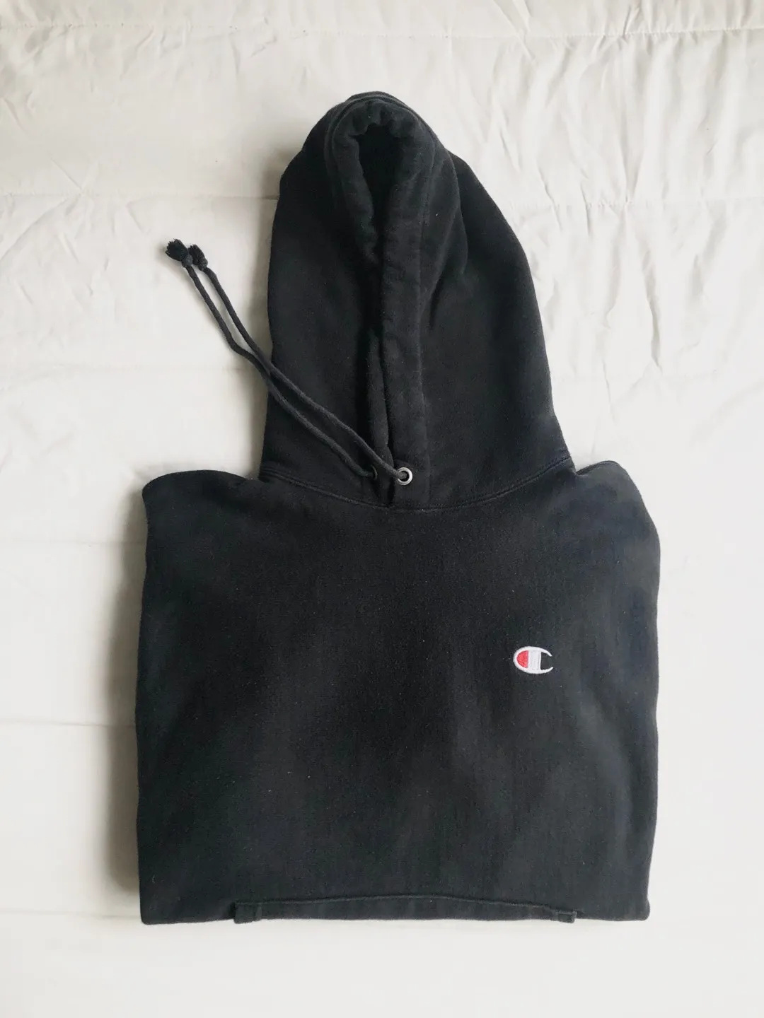 Black champions hoodie (women’s) Size M, could fit small near-perfect condition, rarely worn *bleach splash on the left arm