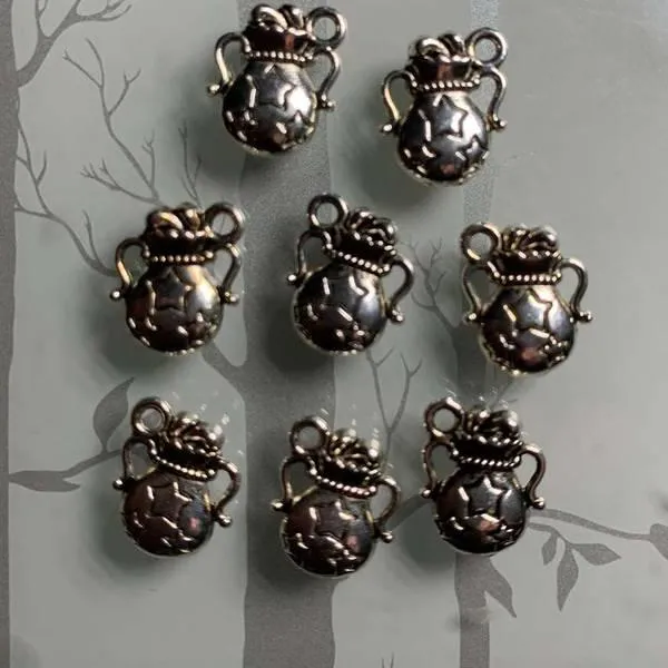 Cute little charms for your jewelry-making delight! Antique-finish silver metallic teapots. Have fun with it! Shown next to dime in second photo for size perspective.