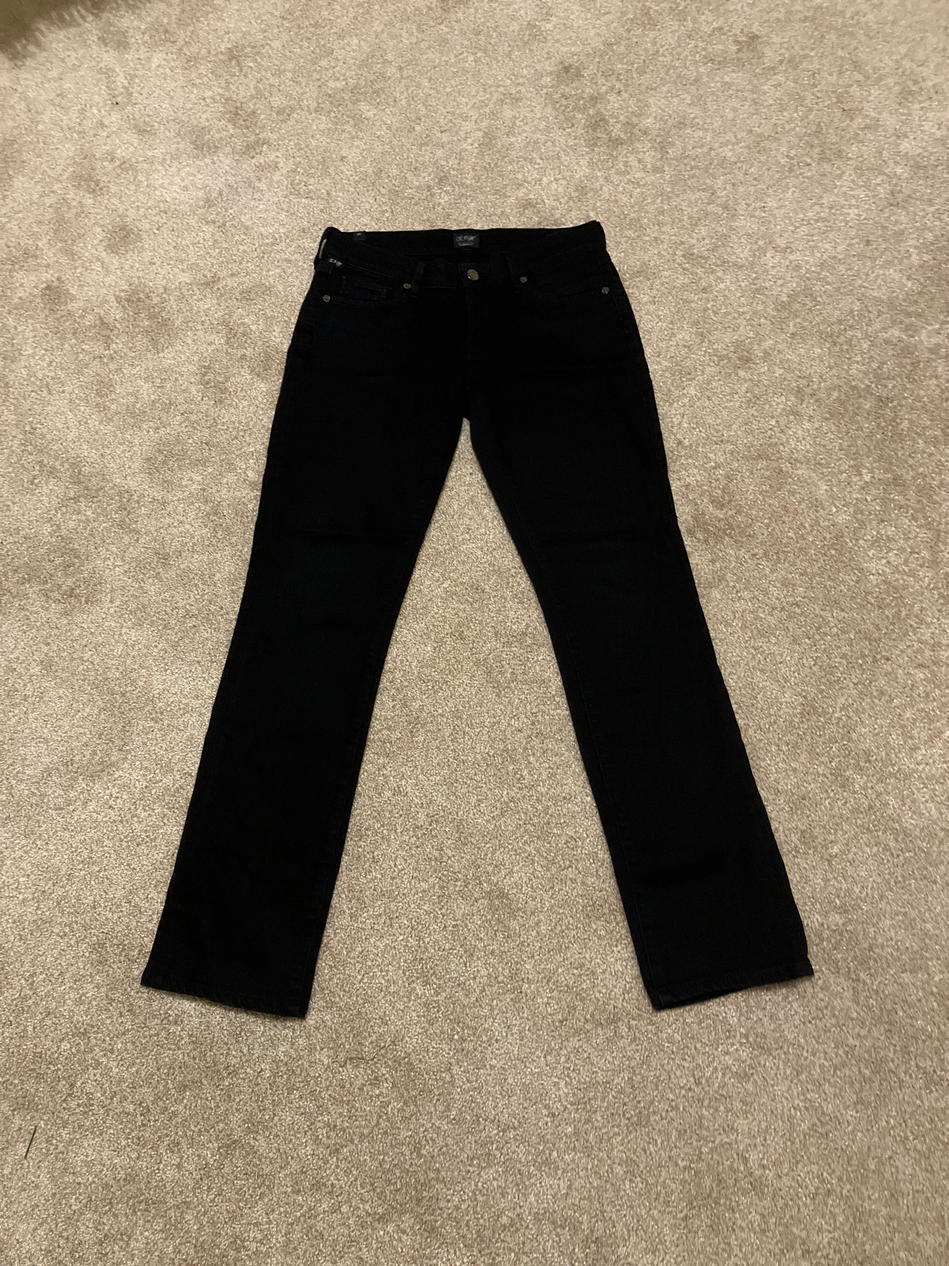 Size 26, low rise straight leg. Black. Bit of wear near bottom hem of one leg.