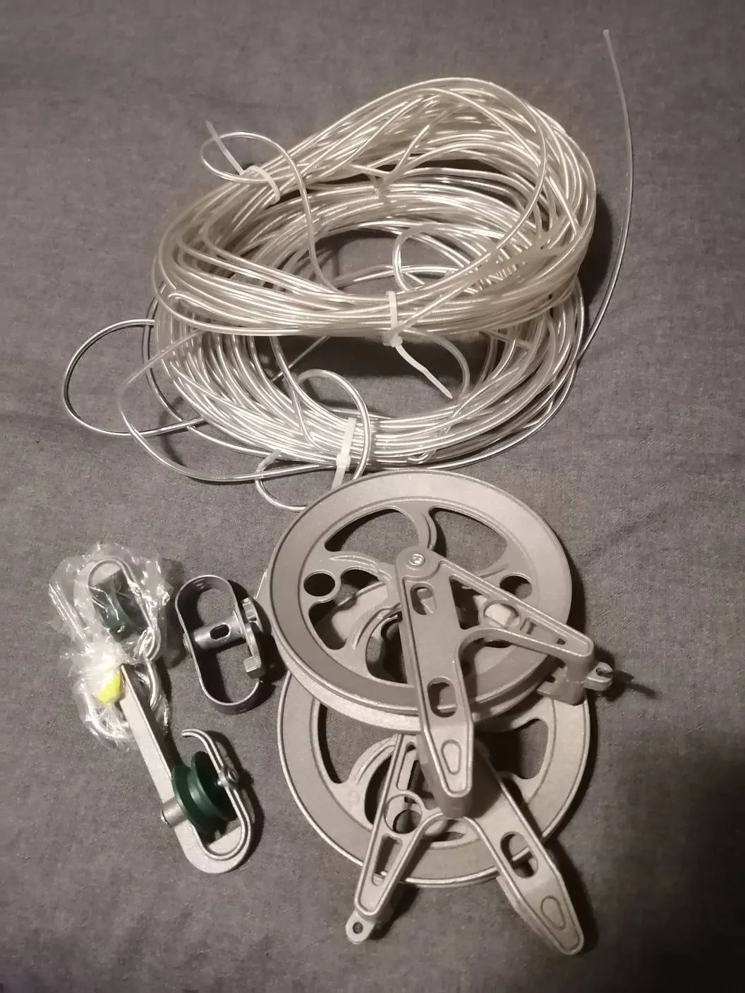 Quite a long clothes line so you can hang your clothes outside now that it's nice. I think it was originally 50feet and we cut it in two. I also have a bunch of wooden clothes pin you can take.