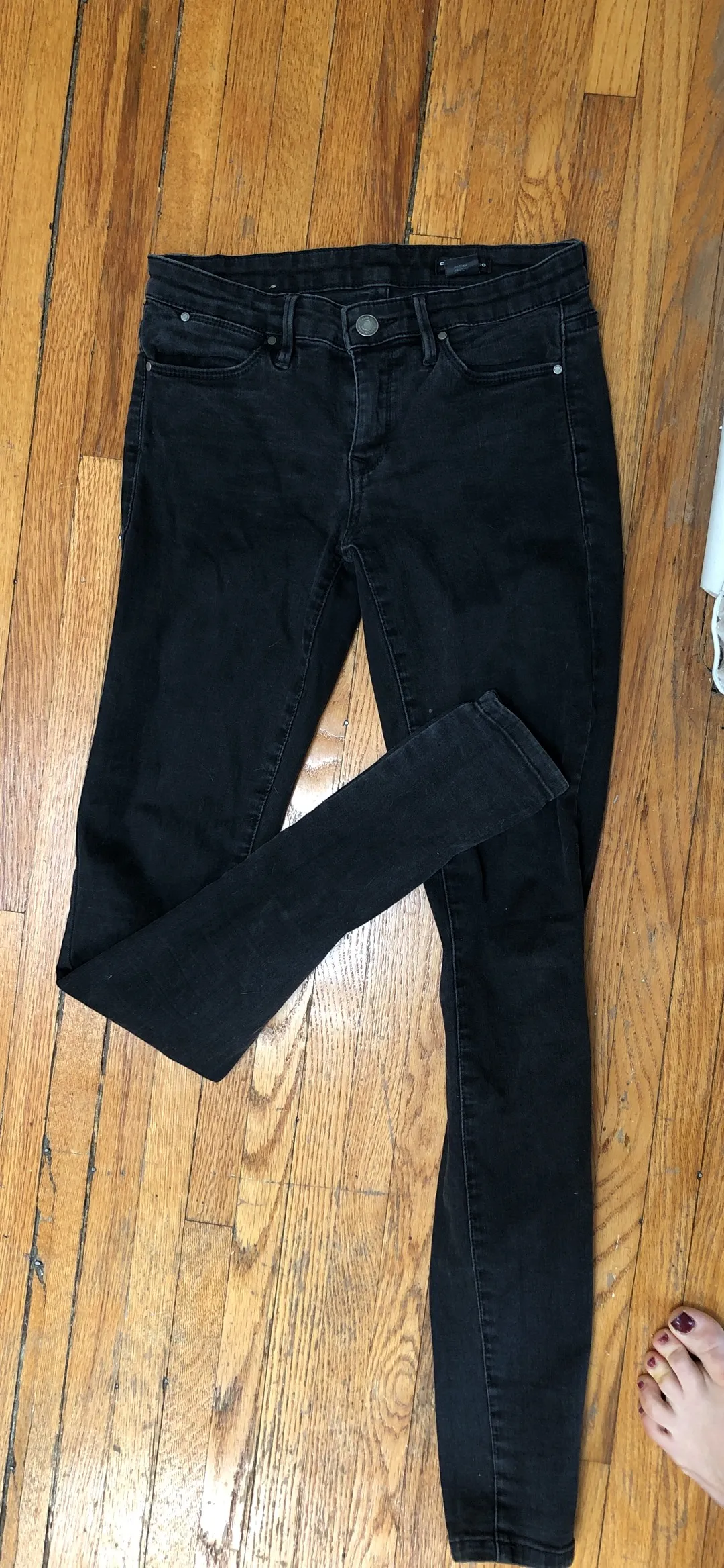 Some stretch. Nice charcoal grey colour. Mid rise.
