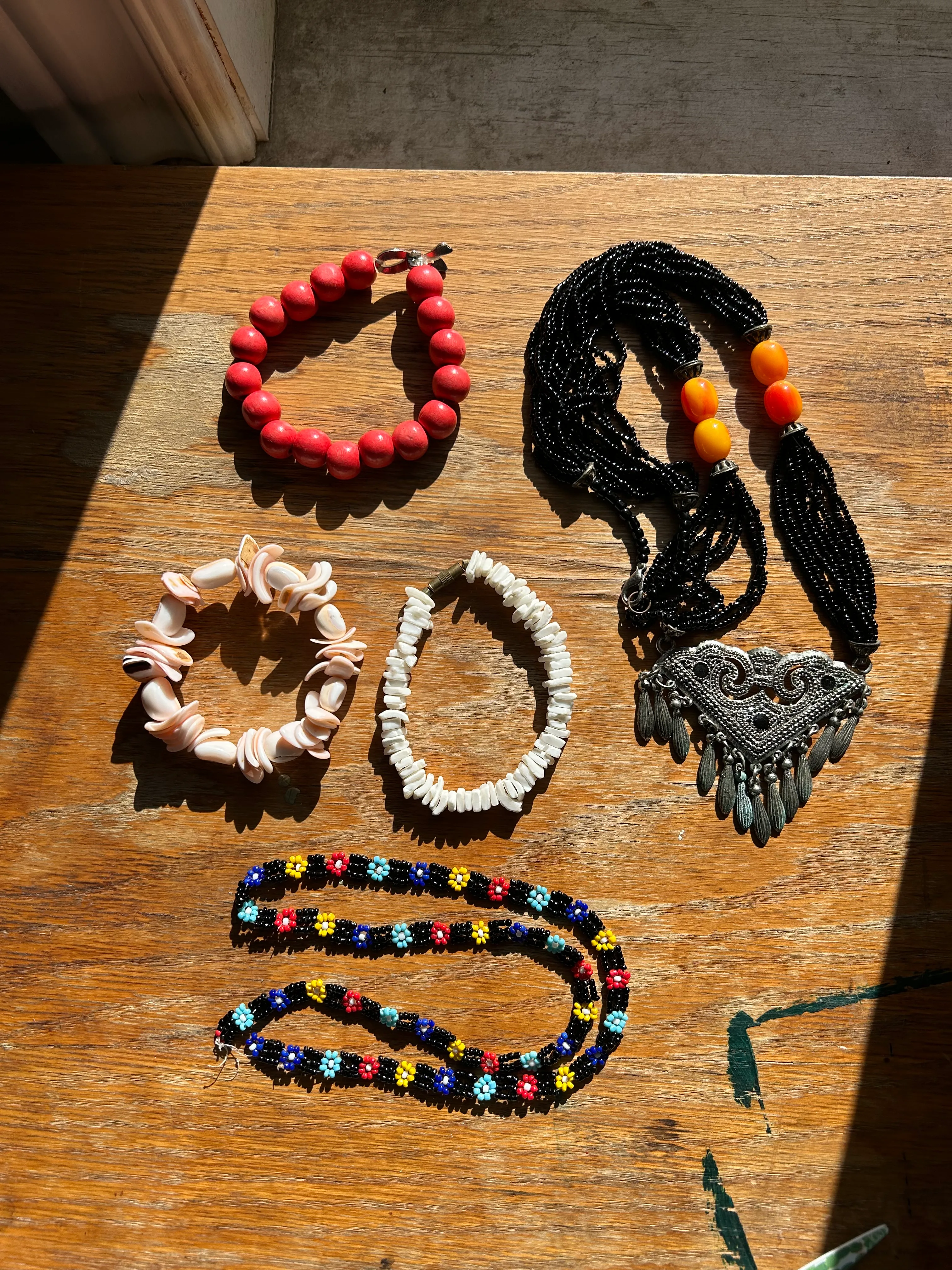 Vibrant set of beaded jewelry including necklaces and bracelets. Features red, black, orange, pink, and white beads.