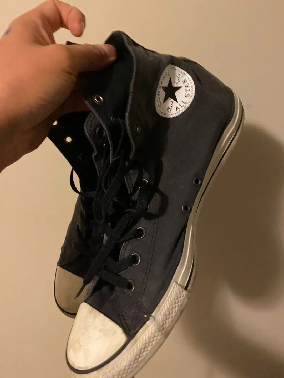Unisex Navy Blue / Grey colour Hi Top Chucks sneakers size 11.5 (women’s 13.5). They never quite fit me as I am a 12. Probably ideal for a size 11 person (half size). No wear or colour loss on the canvas or stripping of the rubber along the rim of the sole. They were put aside for some time but I can steam them and even deodorize for those concerned.