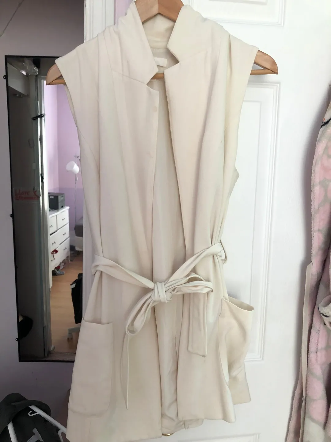 Great for layering with a long sleeve underneath. Minor stain on upper right. Although I actually haven’t tried cleaning it off so it may come off!