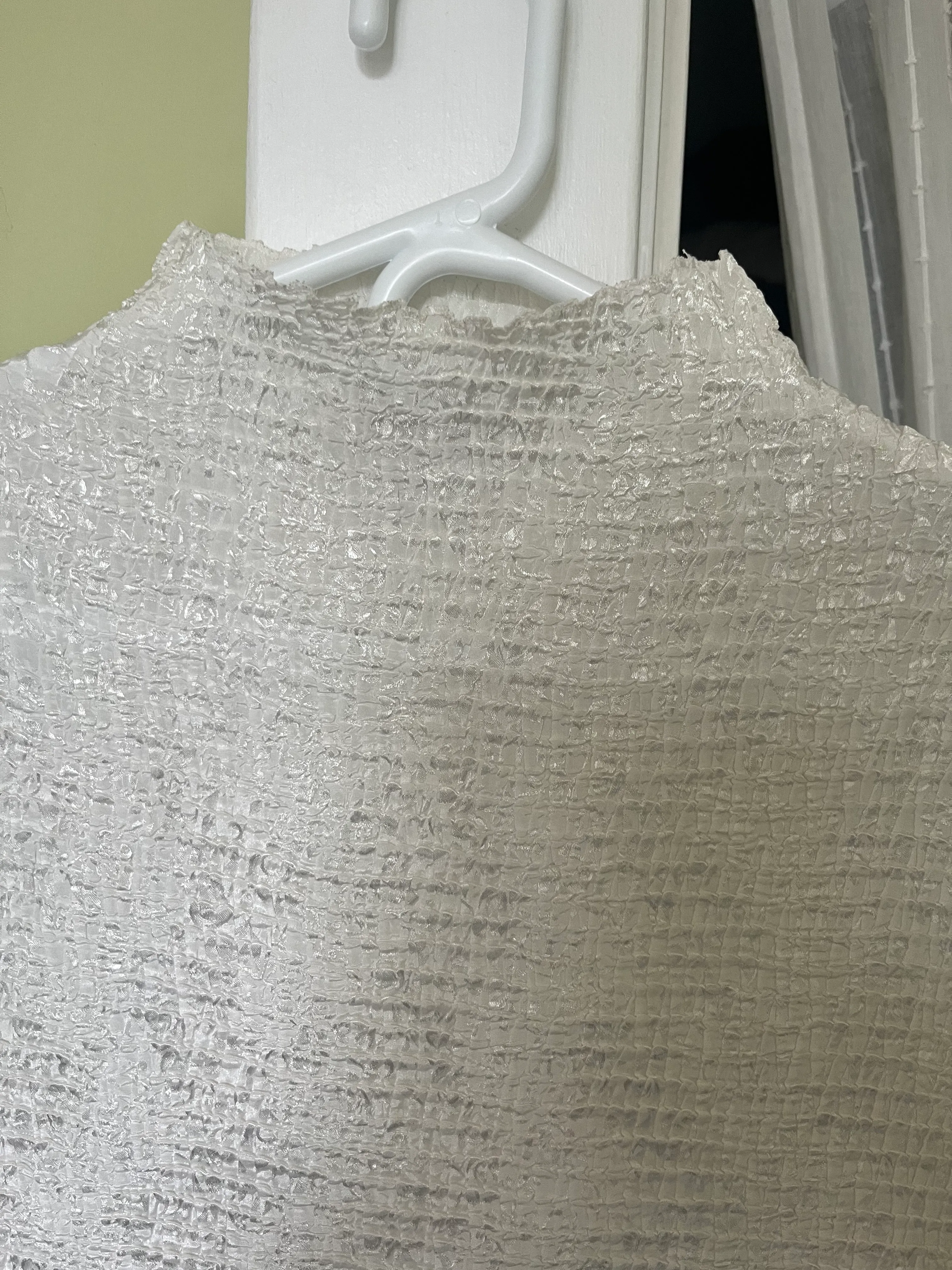 Loves this when I thrifted it but don’t have occasion to wear it much while working from home. About size 8-12 bc it’s that stretchy crinkle material. Looks great with jeans or tucked into a skirt
