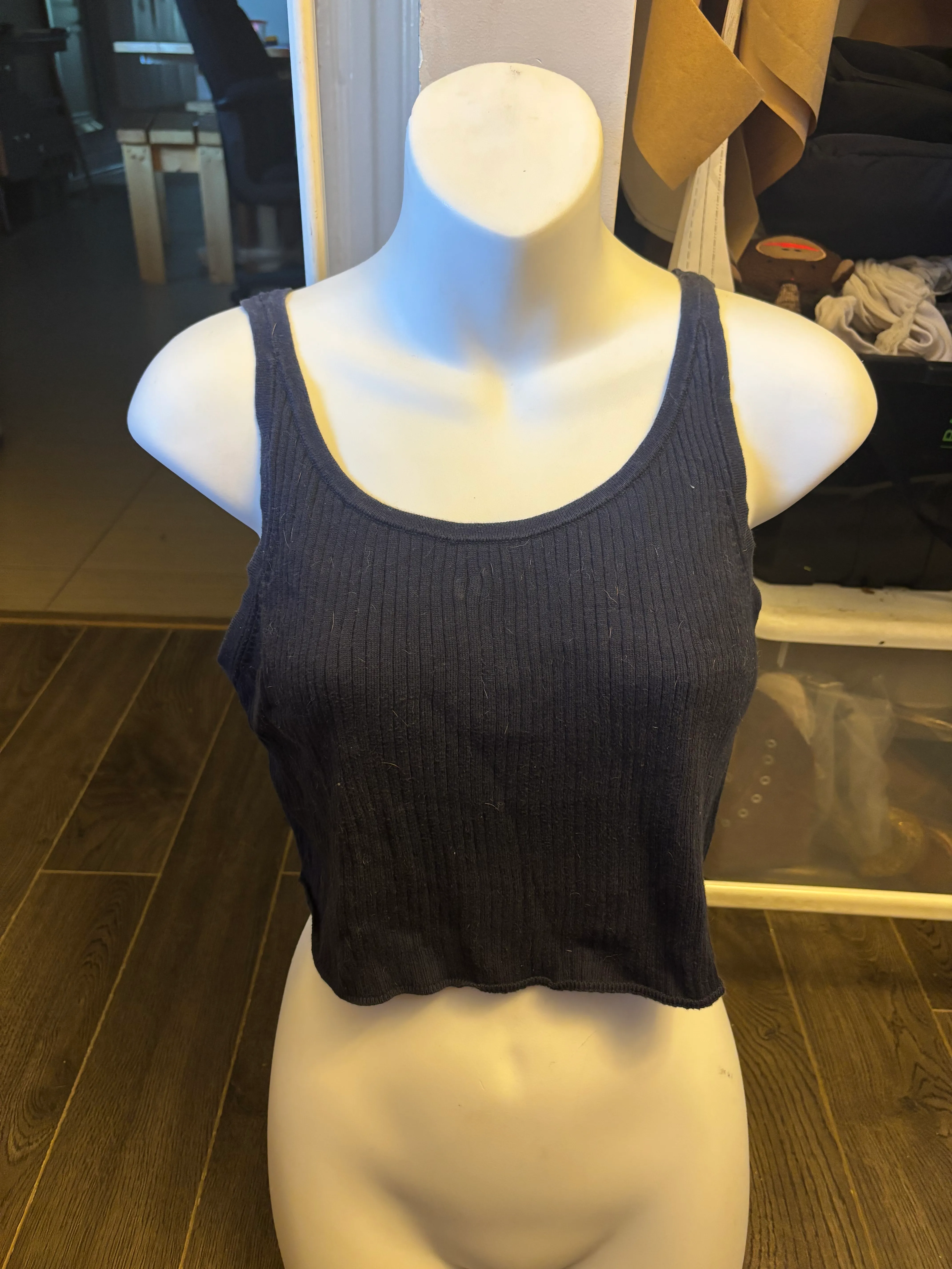 100% cotton top, it’s shrunken from use so I’d say fits better S/M than M for that oversized look