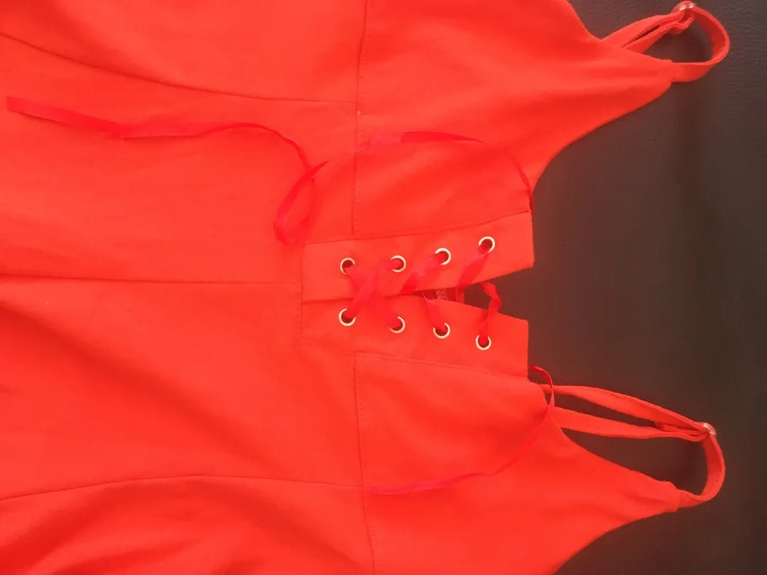 Bright orangey dress with criss cross tie design on the front. In great condition! Fits XS-S