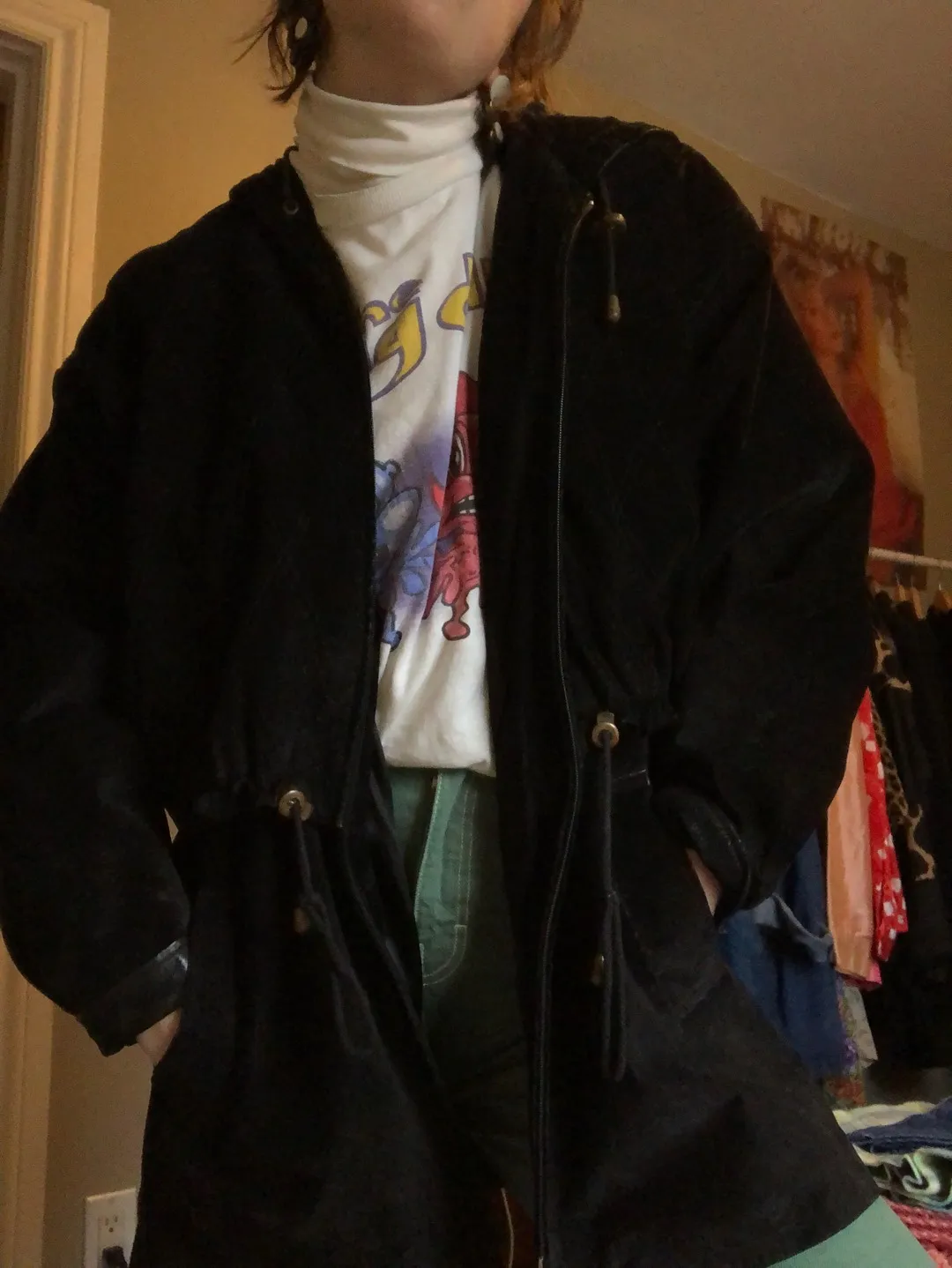 Has chords to pull around the waist for that nice cinched fit 💛 and a hood! And pockets! Great jacket, super warm ~ goes with everything