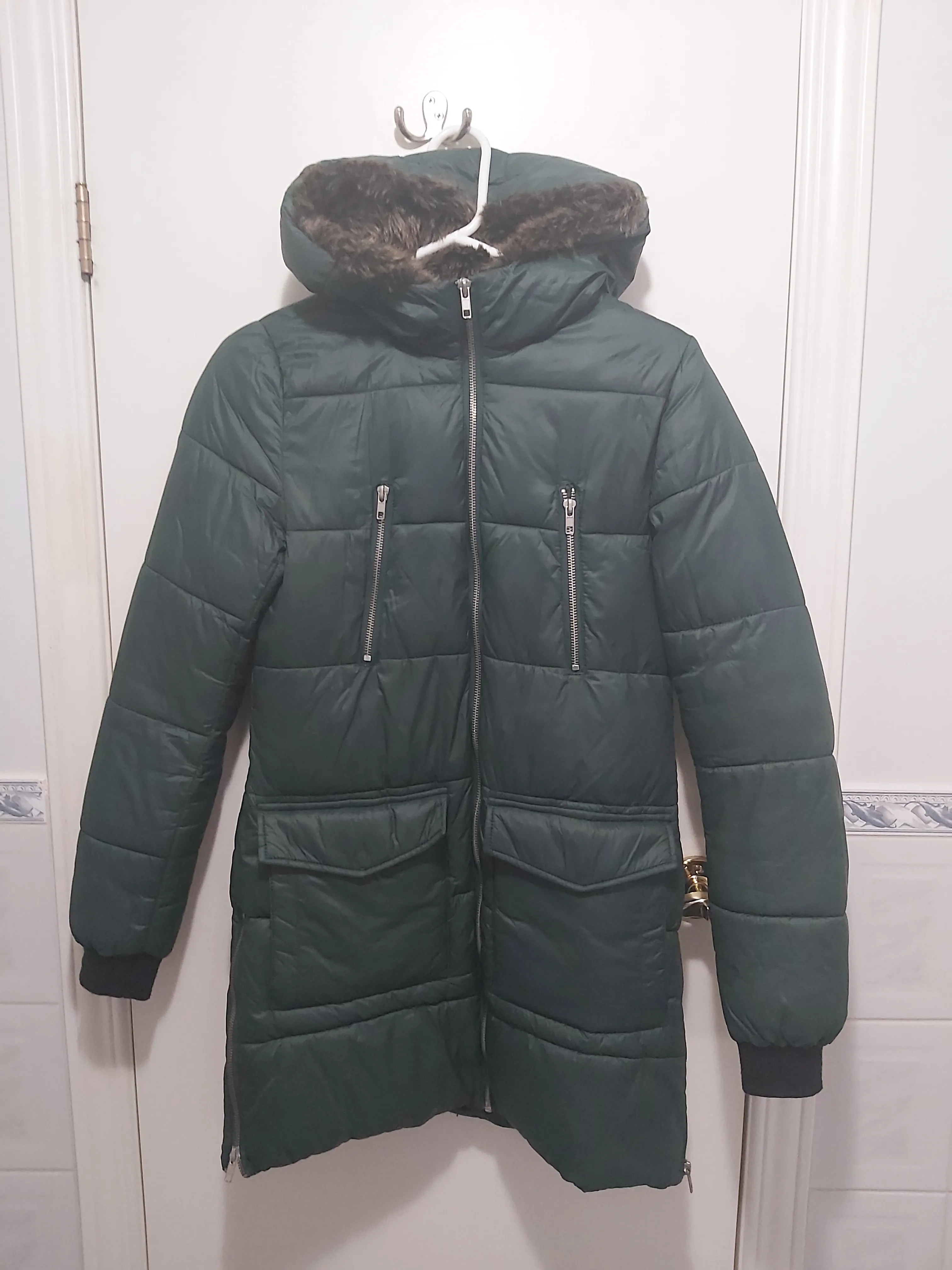 Size extra small (XS) dark green puffer coat from Garage. Lots of pockets (two zipped ones near the chest and two buttoned large ones on the bottom). Can open zippers on the size to give yourself more space too.