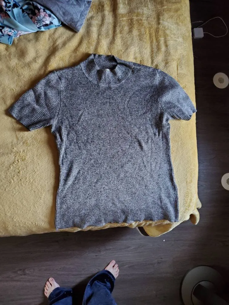 Despite the short sleeves, this grey turtleneck has material that can keep you warm, and fits a size large large in dynamite, but it's also stretchy. 10$ value.