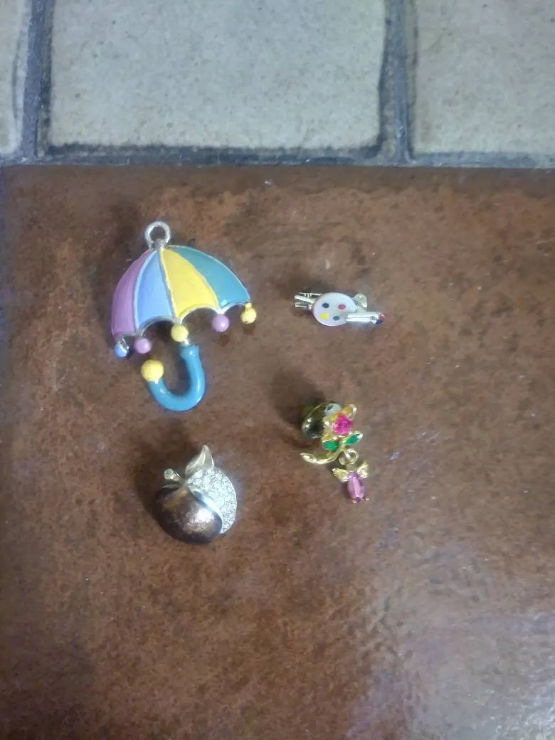 Umbrella, artist painting palette, gold apple, flower.