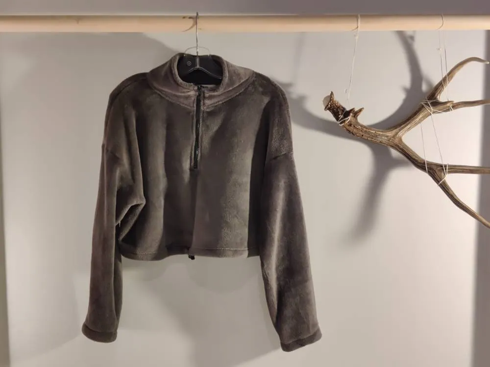 Size small. A purplish-grey cropped fuzzy sweater. Very very warm. :)