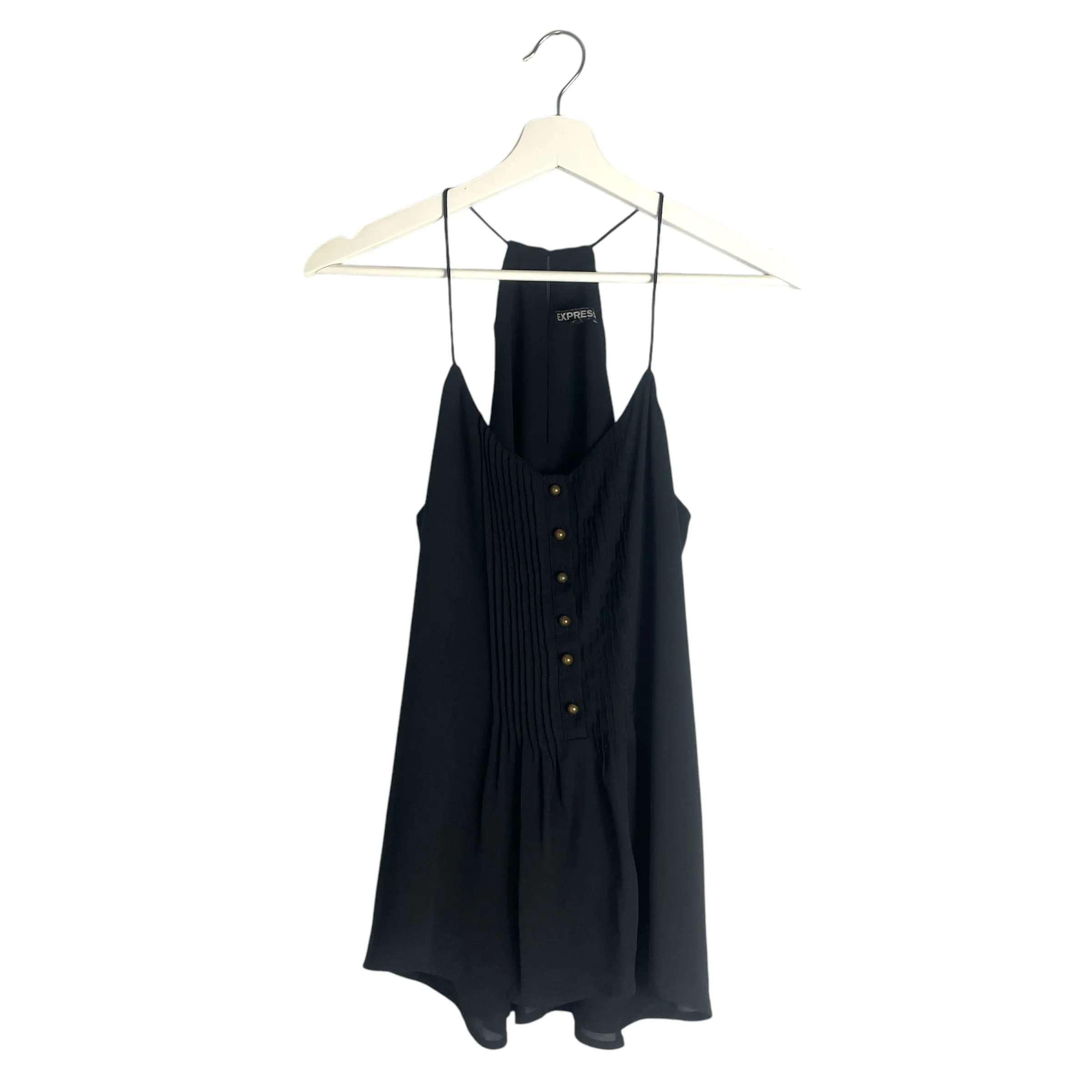 Express Black Satin Cami Tank Top with Button Details Size Small Great worn condition Black satin cami tank top with brass buttons and front pleating. Fully lined. Keyhole back. Spaghetti straps.
