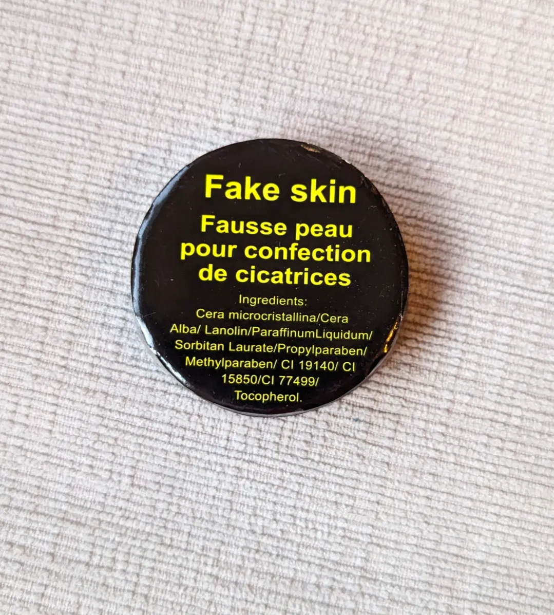 A round container of fake skin. This item can be used to create the desired effect for Halloween costumes.