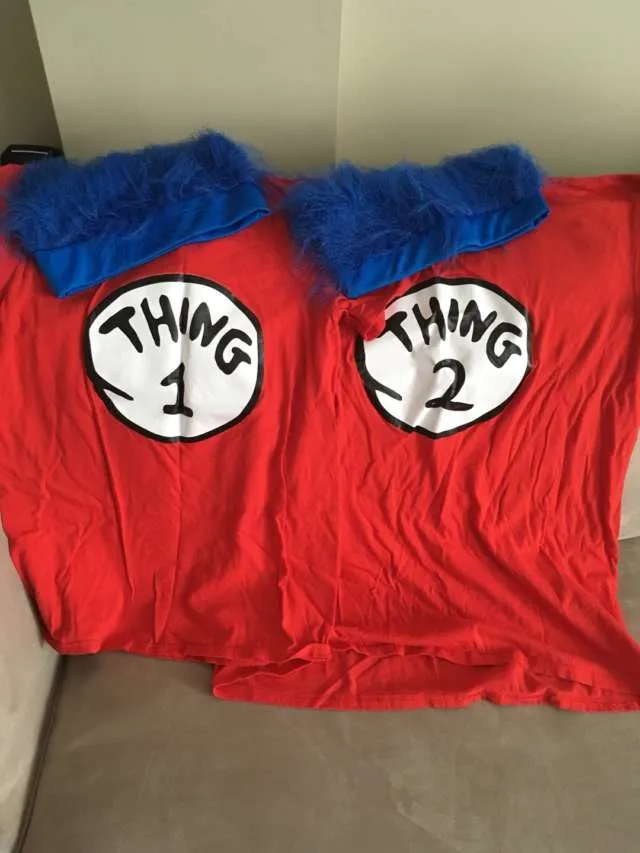 Family Halloween costume worn only once last year. Thing 1 shirt in size small. Thing 2 shirt in size large. 2 blue hair headbands. Cat in the Hat costume in size small (my son wore 4T and he wore this easily with a fall coat underneath while trick or treating). Shirts were $25 each, wigs were $10 each. Cat costume was about $30.
