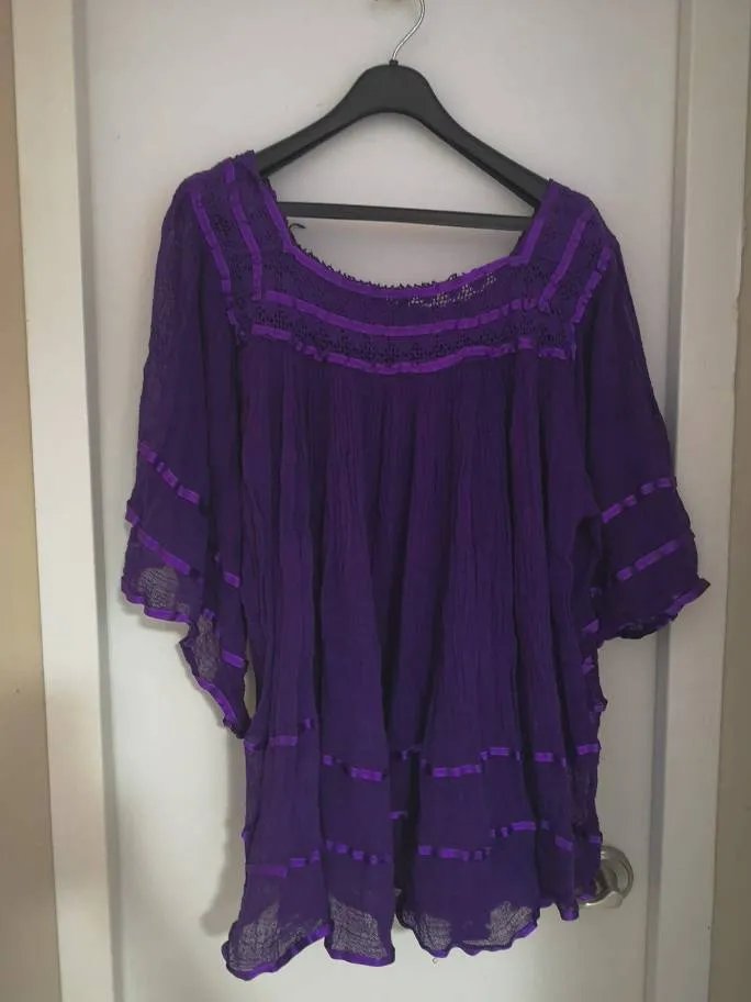 Purple super light Mexican blouse Size M but because of the material and design, could be L Not looking for much, maybe 1 token or 300 btz