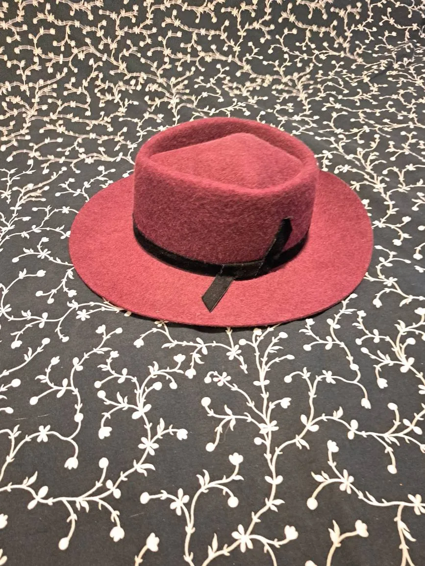 New, never worn. Brim is stuff and round, flips up slightly in back (3rd pic). A little deeper purple than reflected in photos