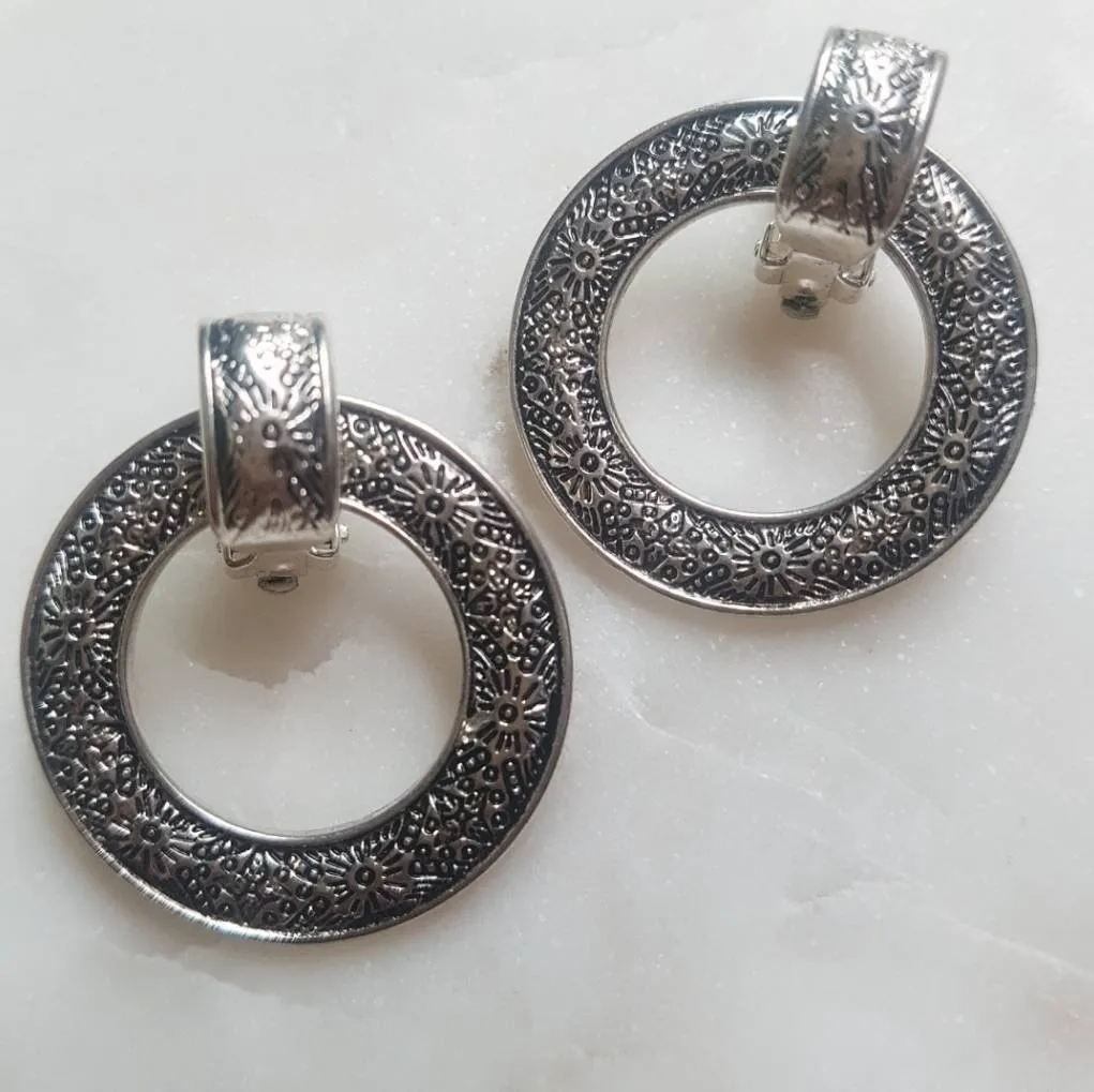 Worn once (briefly when they were given to me), but never again. I've already given them a good clean and doused them in rubbing alcohol. I'm not sure what these are made of, but it's not real silver. They've just been sitting in my jewelry box so they're in fine condition. The slight yellowing on the soft white backing piece is just from that part slowly aging/discoloring over the years.