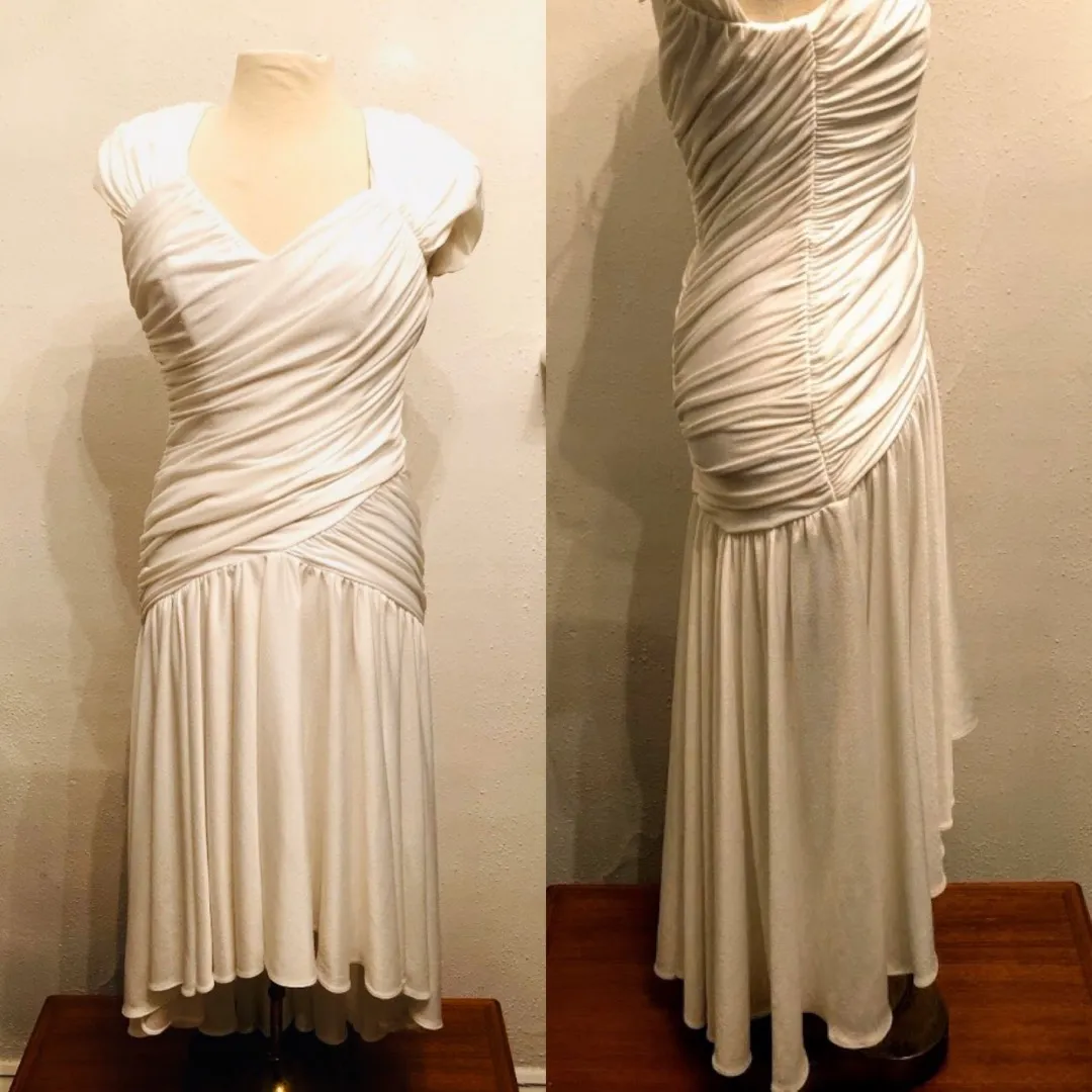 get ready to Climax in this white poly ruched jersey white 198s Climax label dress waist 26-30 inches