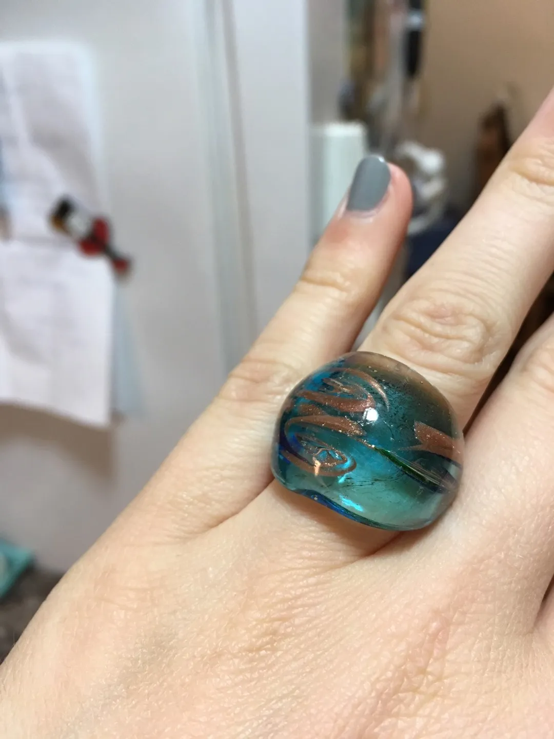 Hand blown glass ring from New Zealand. Turquoise with gold swirls.