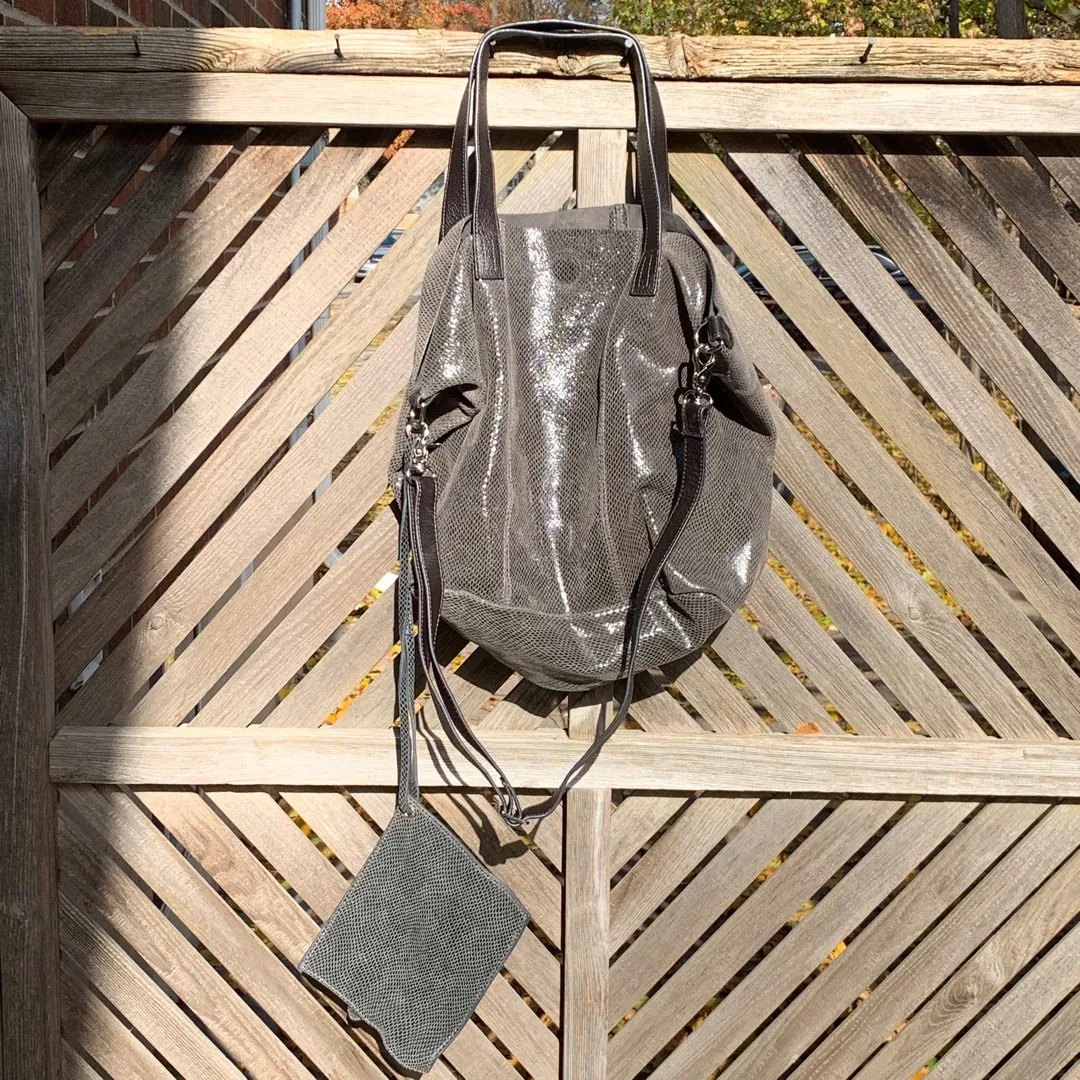 No brand, but it’s real leather. Comes with mini pouch inside. Wear as a tote or as a crossbody. It’s missing the magnetic closure, so it’s an open bag. No interior pockets. Still in really good condition.