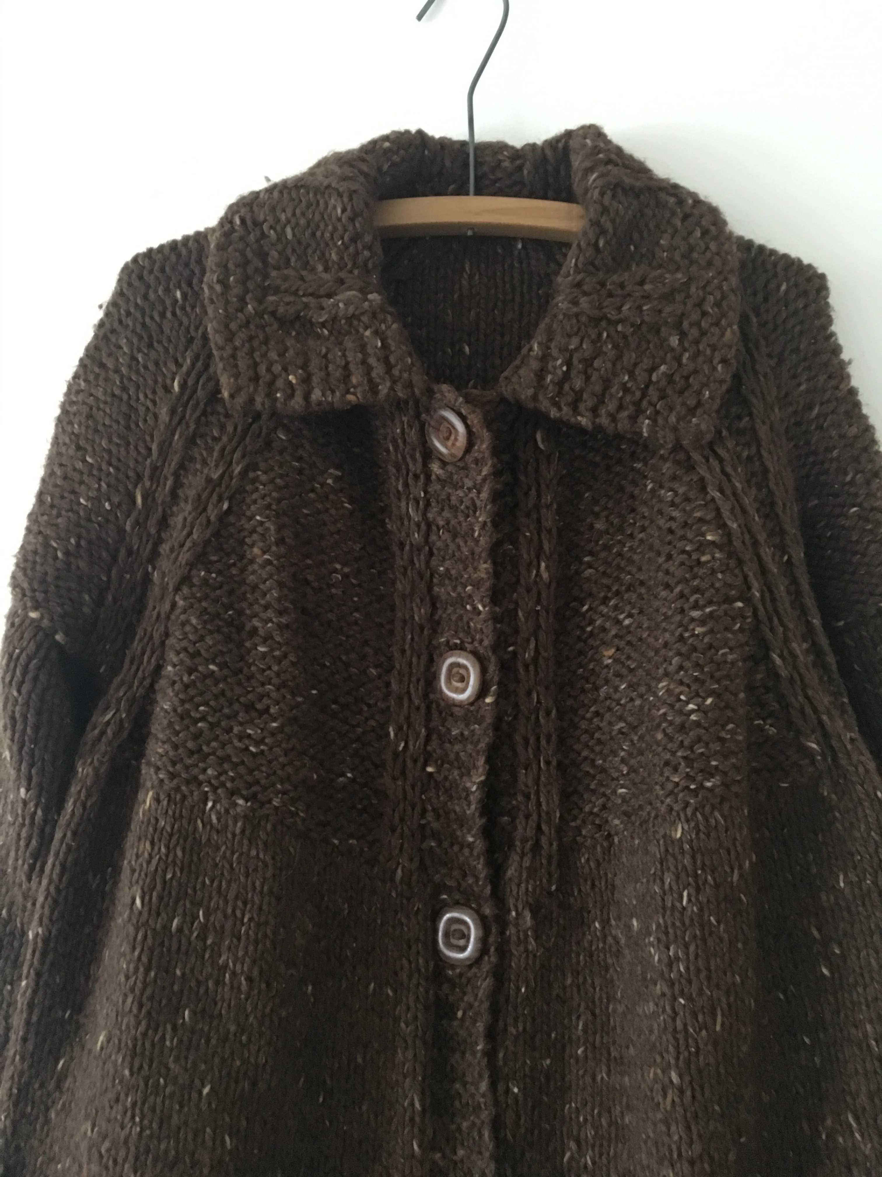 This is a gorgeous hand knitted 100% wool cardigan / coat with pockets. It is stunning! And warm and long. Too big for me. Purchased from the Textile Museum of Canada.