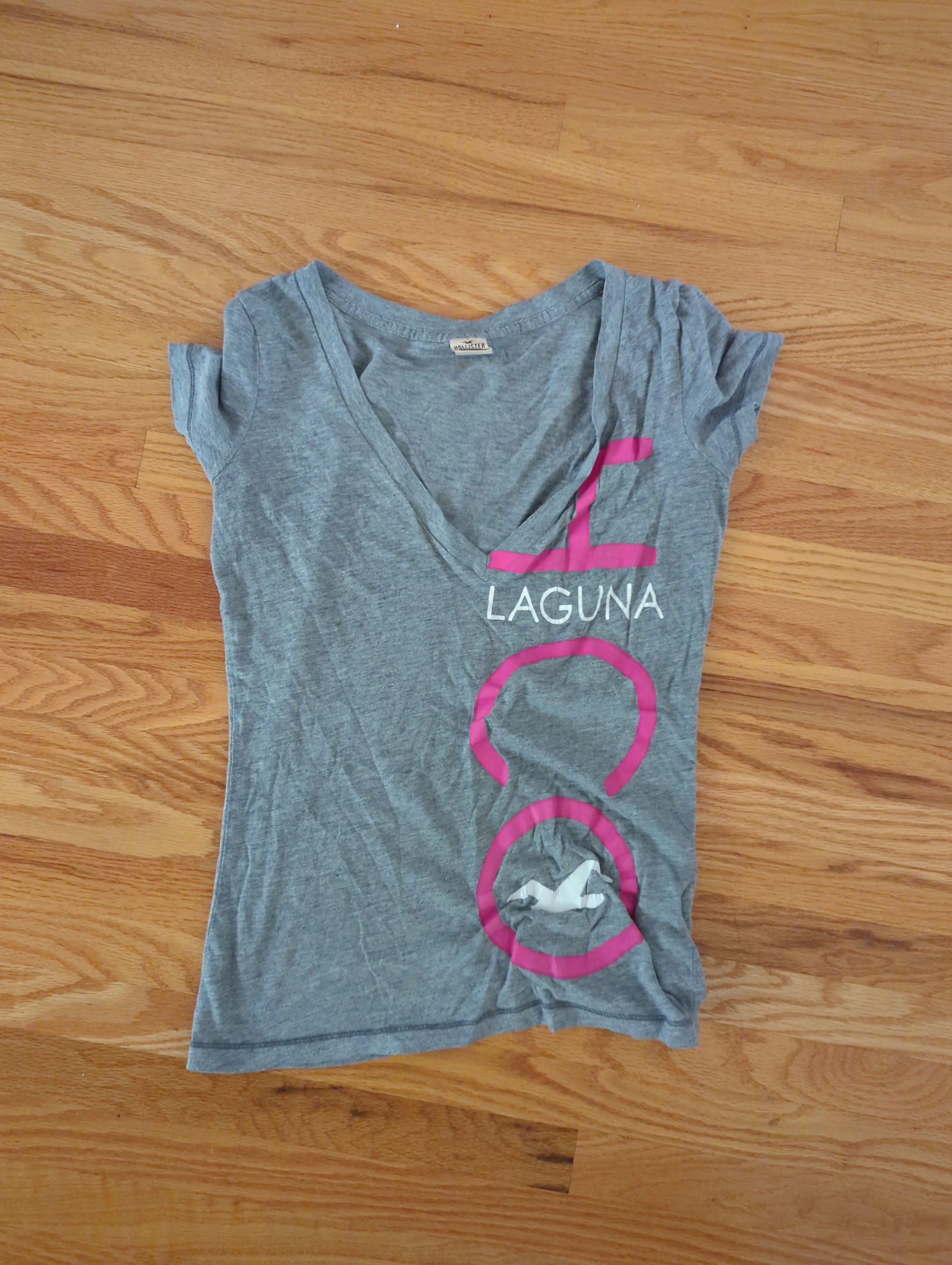 Cute Hollister T-shirt in a light grey colour! It has a V-neck and a pink Laguna design. Perfect for casual wear and in great condition