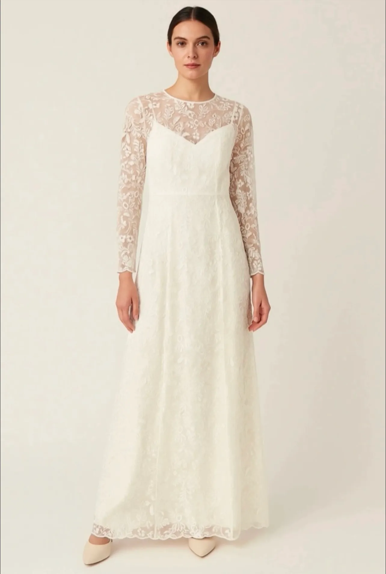 New without tags, never worn in excellent condition. 2-piece dress (outer and underdress). There's no tag size but based on measurements below, it's size 4-6. The silhouette is the same as shown on the model, the pattern is slightly different, pic is just for reference. Long sleeve embroidered maxi bridal dress with an underdress and adjustable straps. The underdress has a zip on the side and the upper dress at the back. The delicate embroidery provides an elegant overlay, and the slip ensures comfort and coverage. $250 value