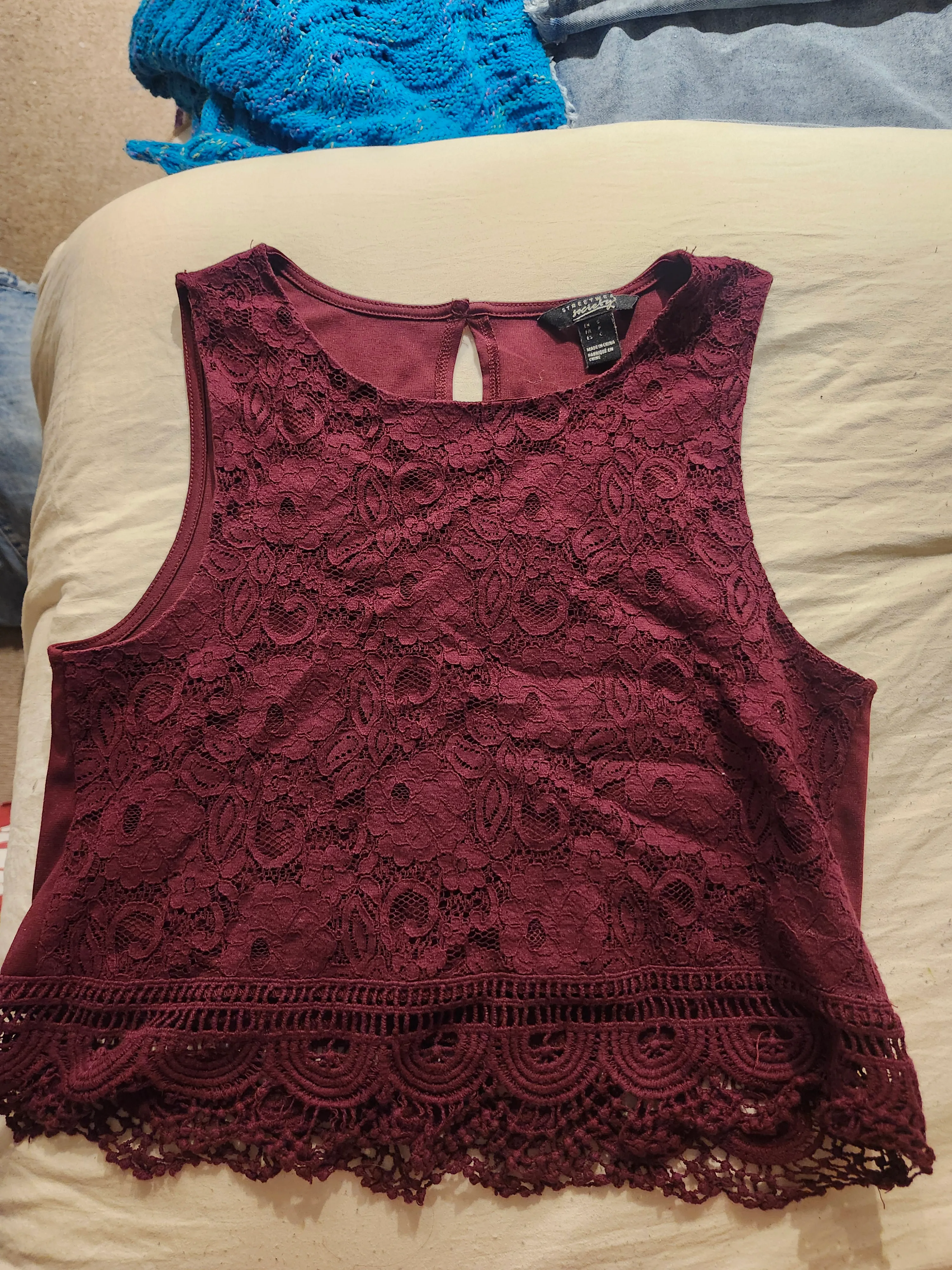 lace tank top. It's a size small and in great condition. The colour is a lovely deep burgundy. Perfect for layering or wearing on its own!