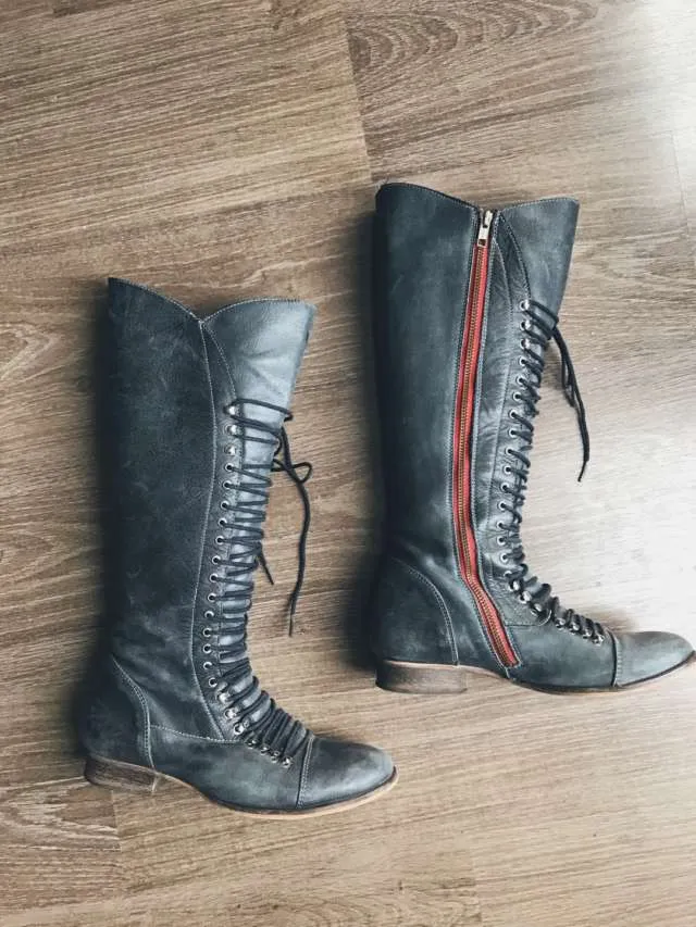 Steve Madden - size 7.5 or 8 (likely 8). They are an off-black? Slightly charcoal and blue hue. They have a red zipper on the inside so they are fitted + flattering along the leg (…and mainly then you don't have to lace them up because ain't nobody got time for that)