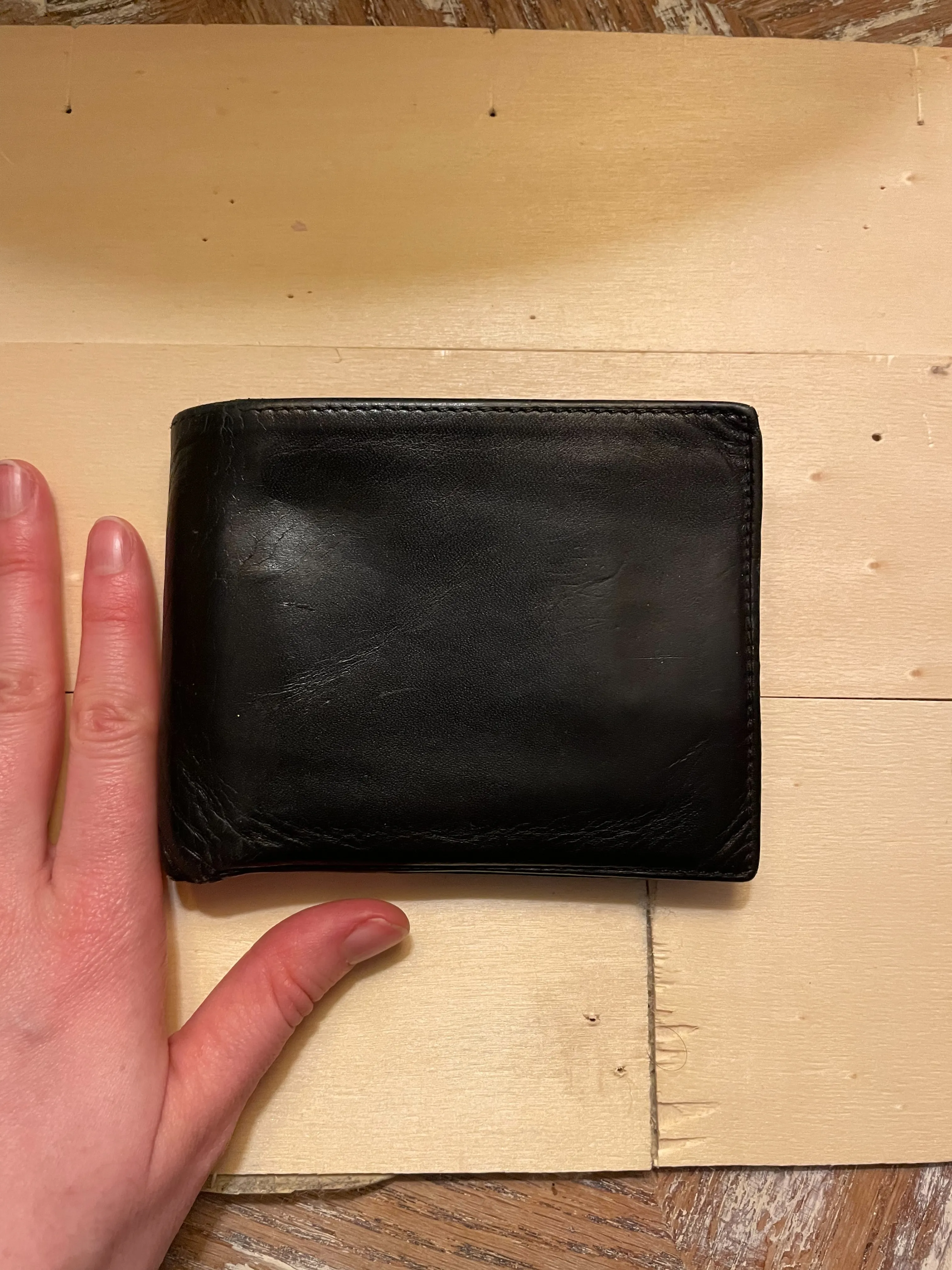 Black leather wallet with many many compartments for a lot of cards. Check all photos for details.