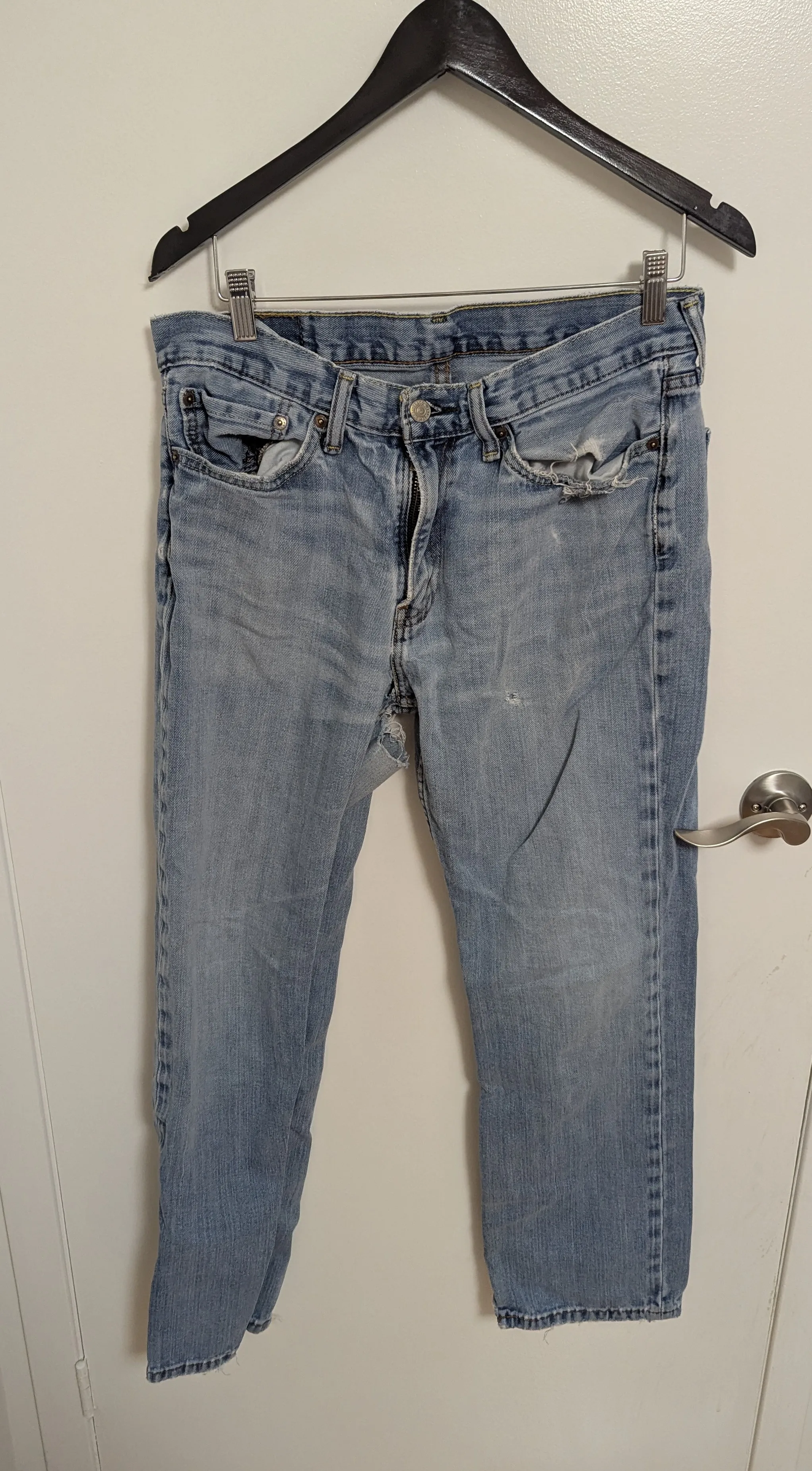 Lightly used Levi's 559 relaxed fit jeans. Light wash denim. Some wear and tear, including small holes.