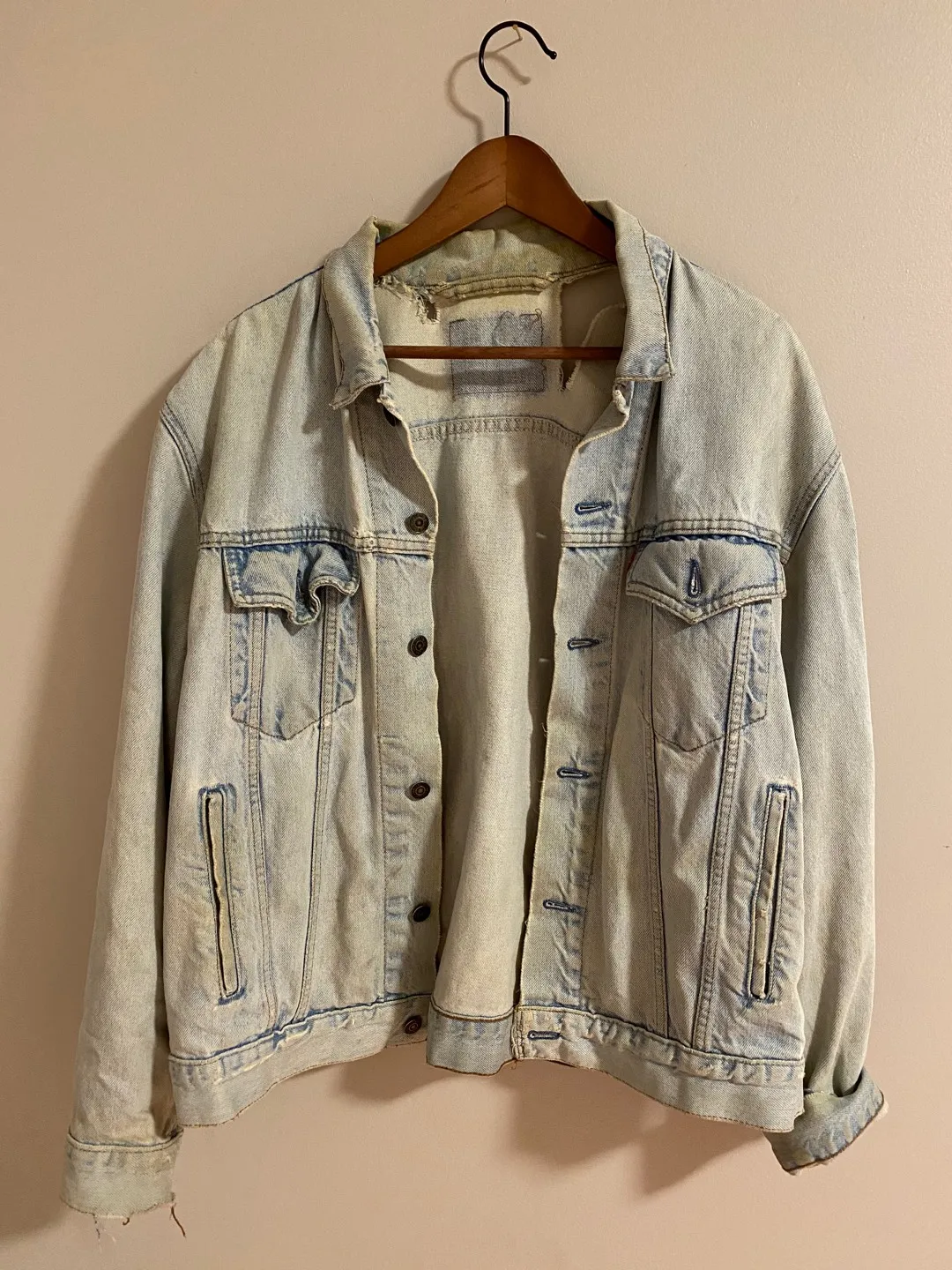 The perfect distressed denim. Faded and ripped in all the right places (large rip on collar in photo #3). Purchased in this condition from a thrift store.