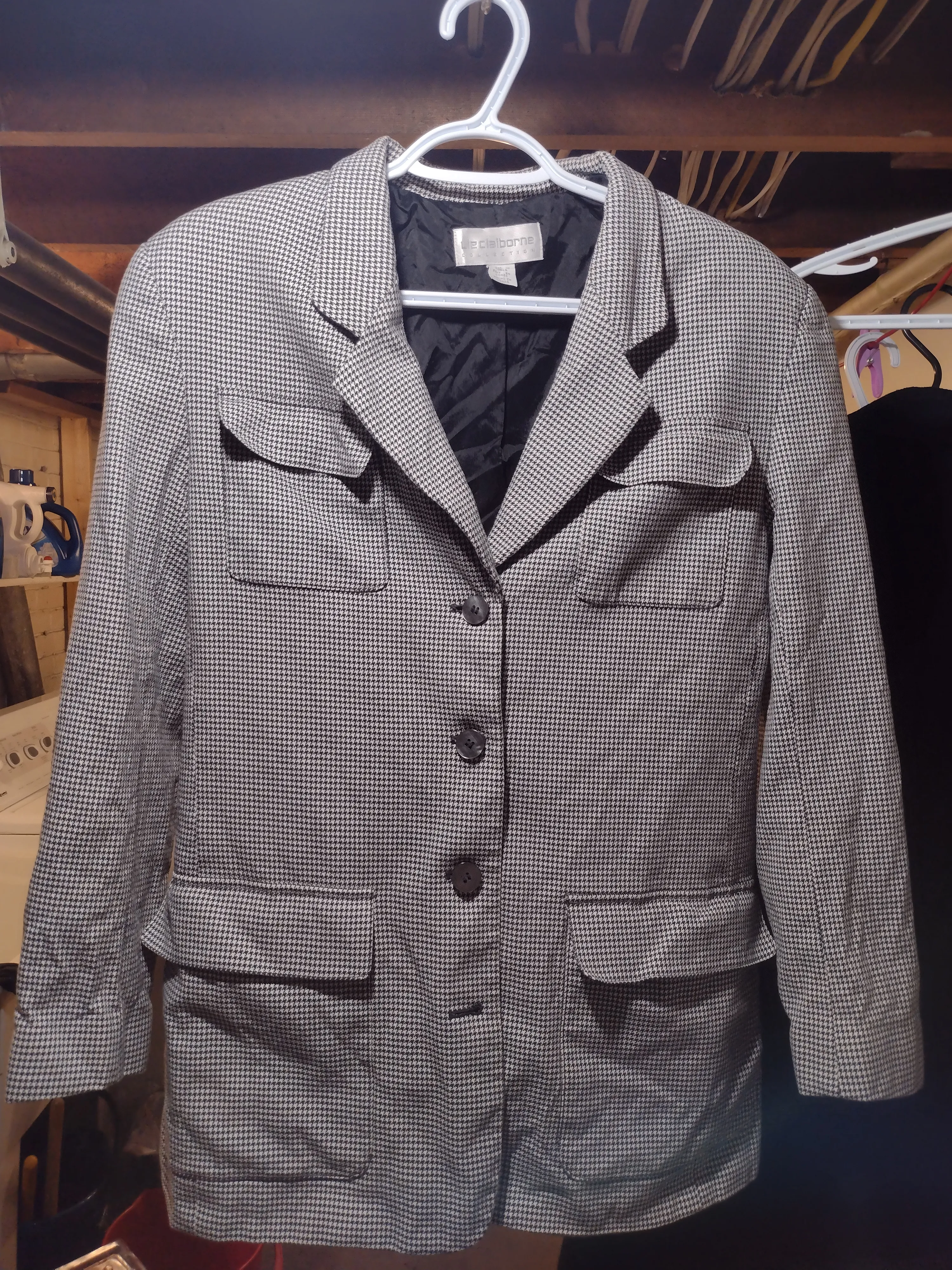 Great condition Liz Claiborne collection houndstooth jacket/blazer. Gently used and cleaned. 4 buttons, padded shoulders and 4 exterior pockets. 57% cotton, 43% rayon. A great vintage fit for fall! Pickup near donlands/greenwood station or in downtown core.