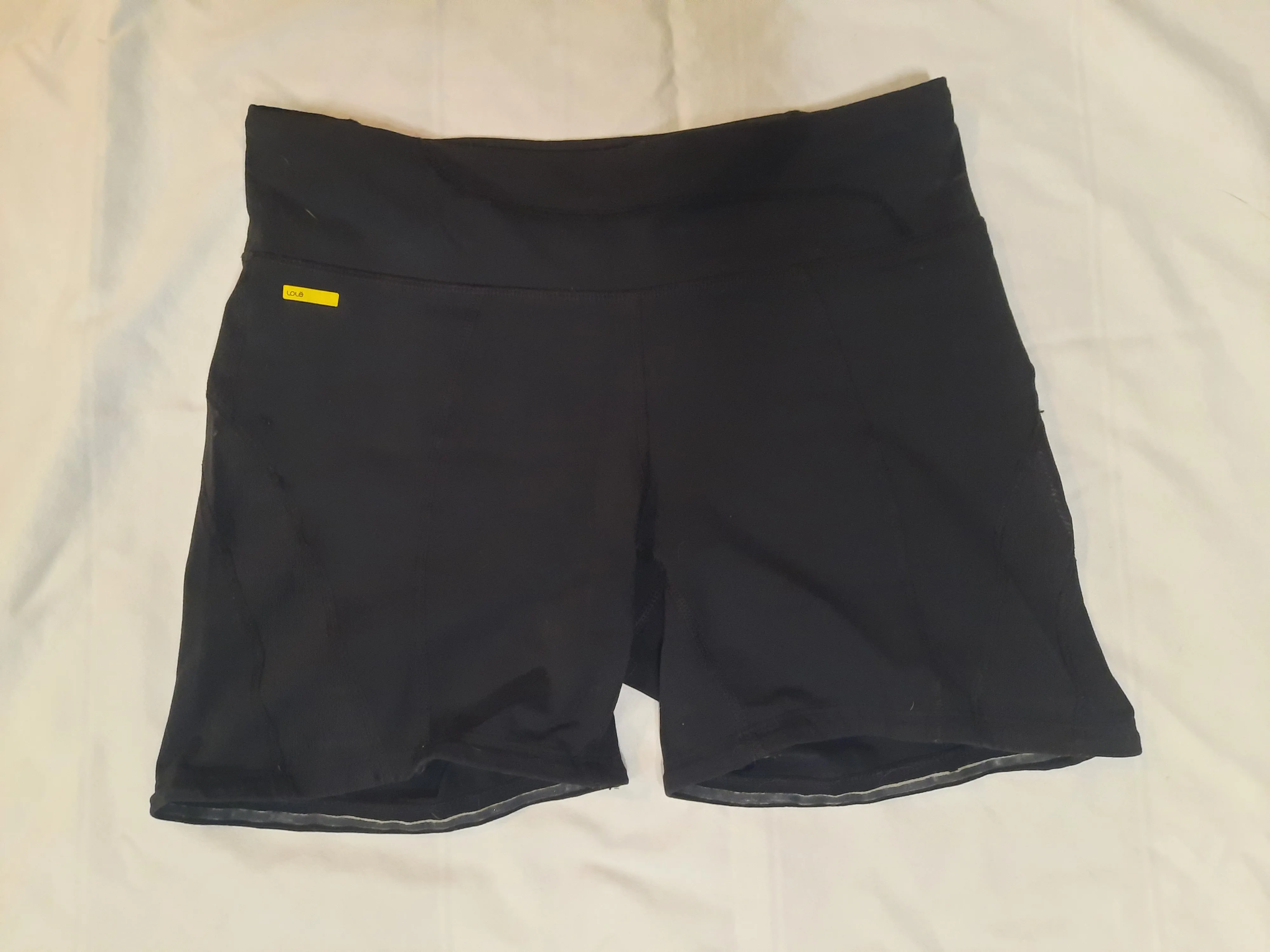 Preloved gently worn condition Inside waistband pocket Flatlock seaming detailing (to prevent chaffing) Linned gusset Contrast inner waistband detailing Inseam Size small but can easily stretch to fit a medium Inseam-5” Waist Flat-14 1/4” Front Rise to top-10 3/4”